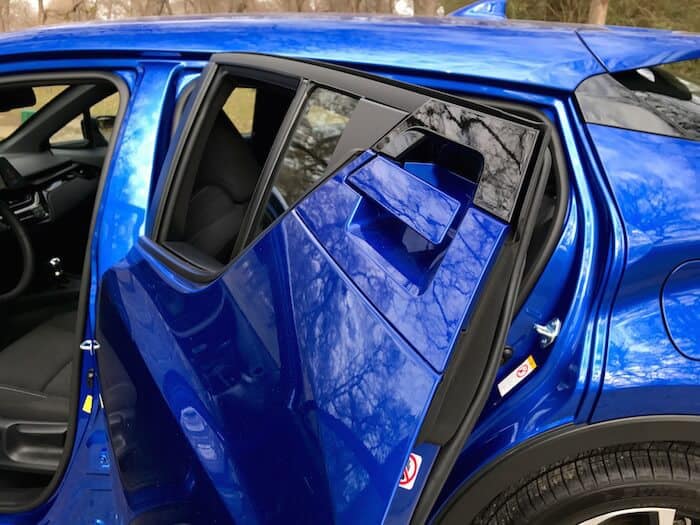 The 5-door C-HR, aka "Coupe High-Rider", is part SUV part hatchback and comes in two trims, the XLE and the XLE Premium. Both equipped with 18-inch alloy wheels. Its heavily sculpted styling is attention-getting, edgy and you either like it or you don't. (I liked it.) Unfortunately, the edginess gets in the way of safety. Take the rear door handles. They're hidden high up into the doors near the roofline, a design that creates a thick rear pillar that both cuts into rear passenger window space and impedes visibility in the blind spot. I was also surprised to see it equipped with halogen headlights. These days, LEDs and HIDs are replacing halogens according to the Insurance Institute for Highway Safety. (The C-HR does come with LED daytime running daylights.)