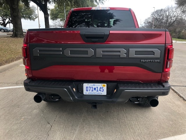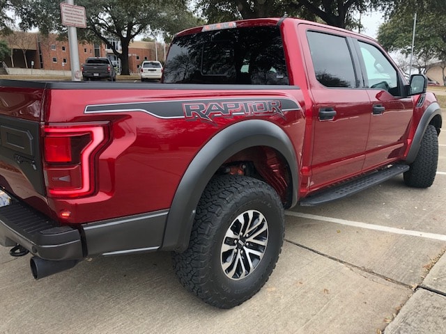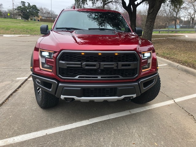 At a glance, you know this is a Raptor. It sports a bold grill with 3 yellow lights in the center, there are large fender flares, tow hooks front and back, and a huge Ford tailgate applique that runs the width of the tailgate. There are also single marker lights on every corner of this pickup; this is a DOT regulation due to its width.