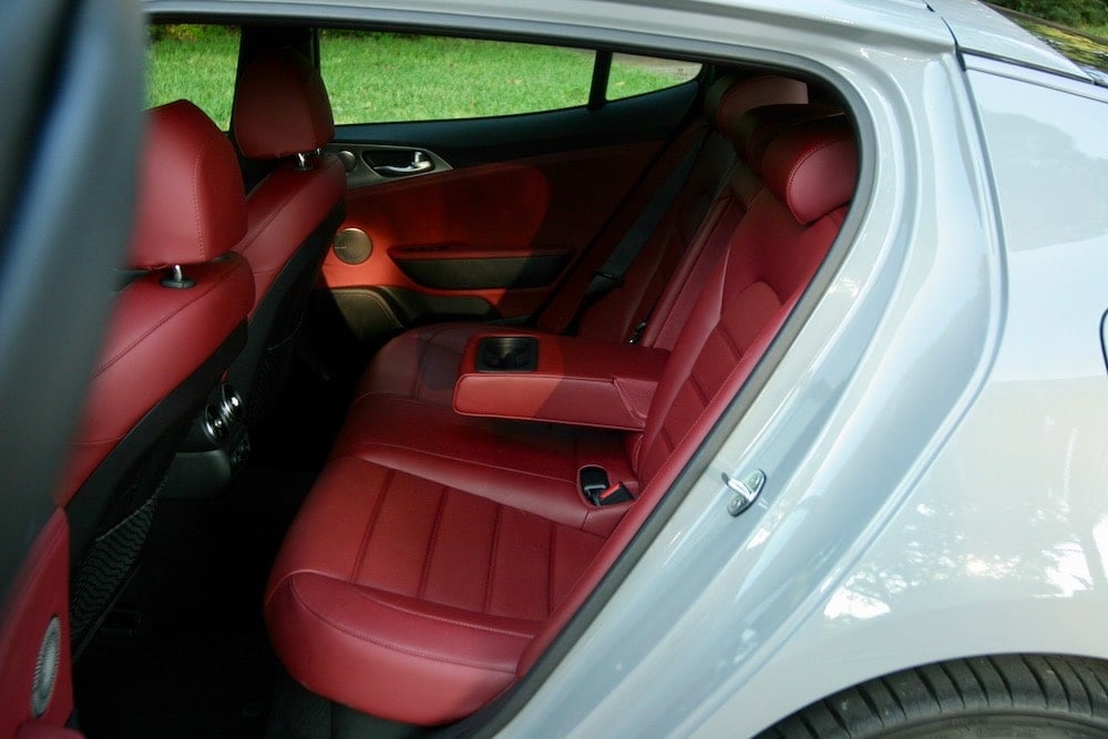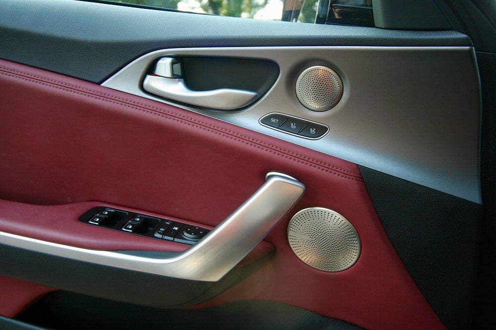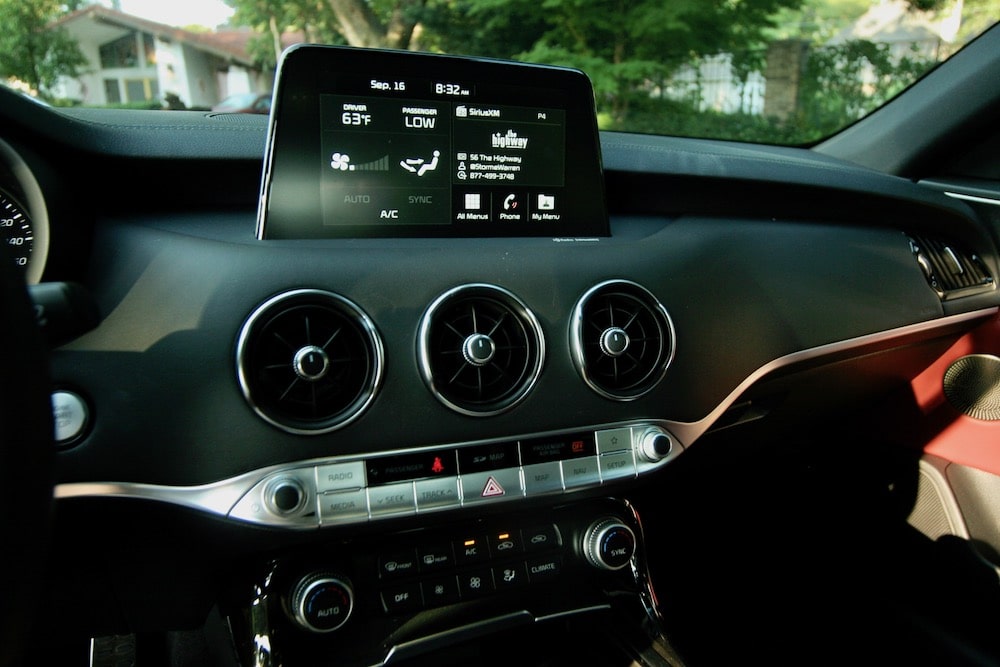 The Stinger’s cabin is driver-centric with Audi influences and includes soft-touch materials, aluminum and satin-chrome accents. Its low-slung seating profile fits like a glove and everything is within easy reach.