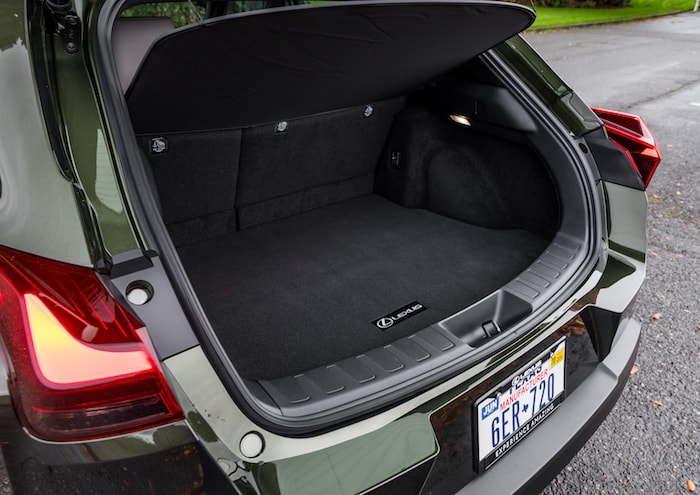 In terms of utility, you have 17.1 cubic feet of cargo space with the 60/40 split manual rear seats up. It’s a bit less than you get in the 200 because the hybrid battery is stored in the back. The UX has aluminum roof rails and heated outdoor mirrors along with mud gaurds and wheel arch moldings. a Tonnaeu cover and carpet floor mats. My tester comes with an optional $600 power rear door with kick sensor.
