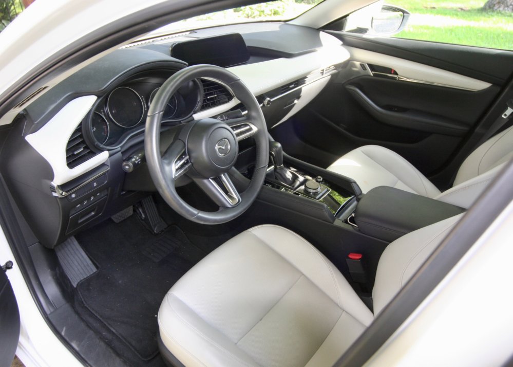 Mazda sets the bar for best interiors in its class and the Mazda3 does not disappoint. It’s a very clean, minimalist interior and the premium trim has a stand-out two-tone leather interior, with soft touch surfaces on the door panels, armrests and dash. The 8-way power driver’s seat, which is heated but not ventilated, is quite comfortable. It’s been redesigned to offer more thigh support and is very comfortable. Memory front seats are also a nice feature for this class.