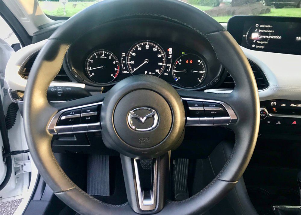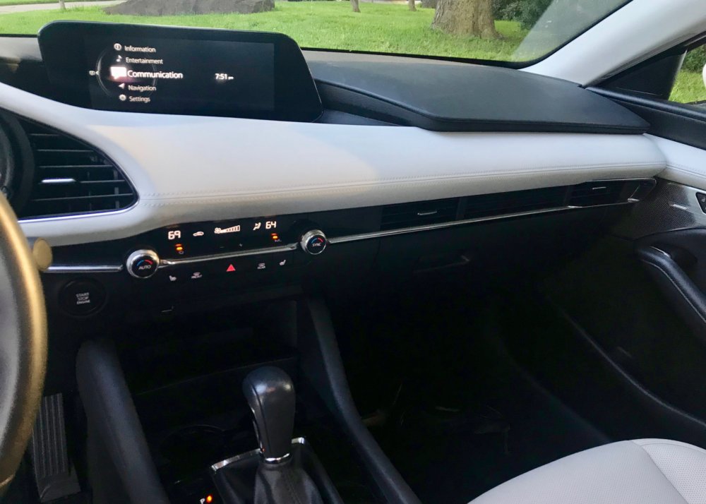 Now let’s talk Mazda Connect. First off, a nice, new 8.8- inch infotainment screen is standard across the lineup. It’s not a touchscreen and its pushed back farther in the dash. You control it via a knob on the center console and I found there to be a bit of a learning curve to navigate the menus, but one surely solved with more time. It’s both Apple CarPlay- and Android Auto-friendly. In terms of connectivity, only two USBs and a 12-volt are standard and though you get Bluetooth, I’m not finding an available WiFi Hotspot.