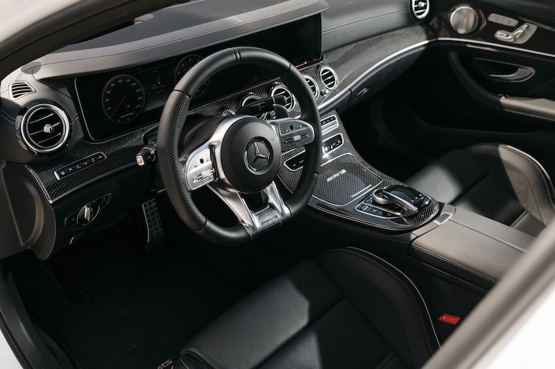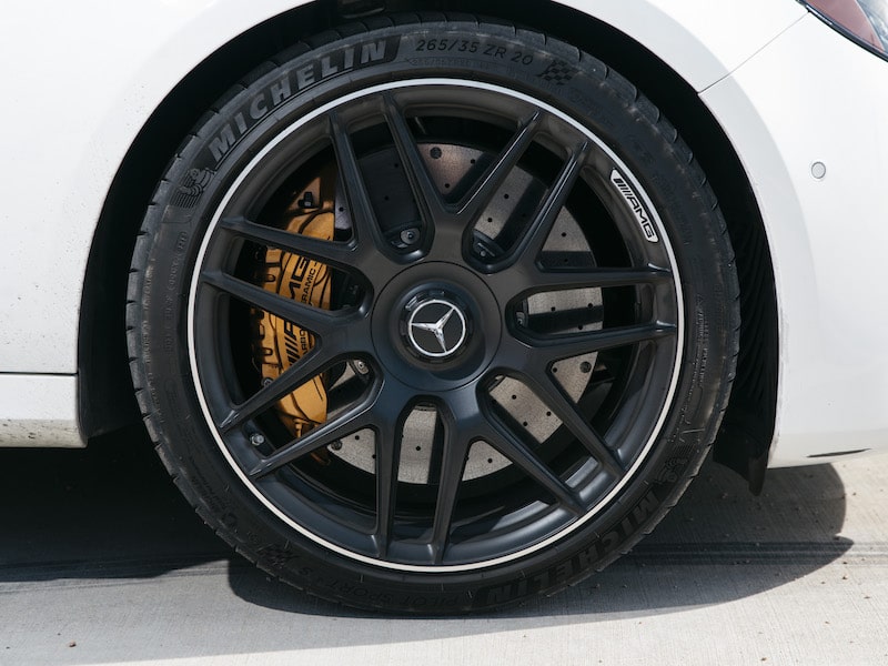 This wagon is attractive on the outside with a low, wide, and aggressive stance. There is a heavily vented grill with front spoiler, and also a rear spoiler that adds to the sleek looks. There are carbon fiber dual exhausts and this car has black 20” AMG wheels. You simply can’t miss the huge brake calipers that are extremely expensive.