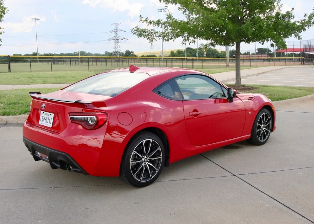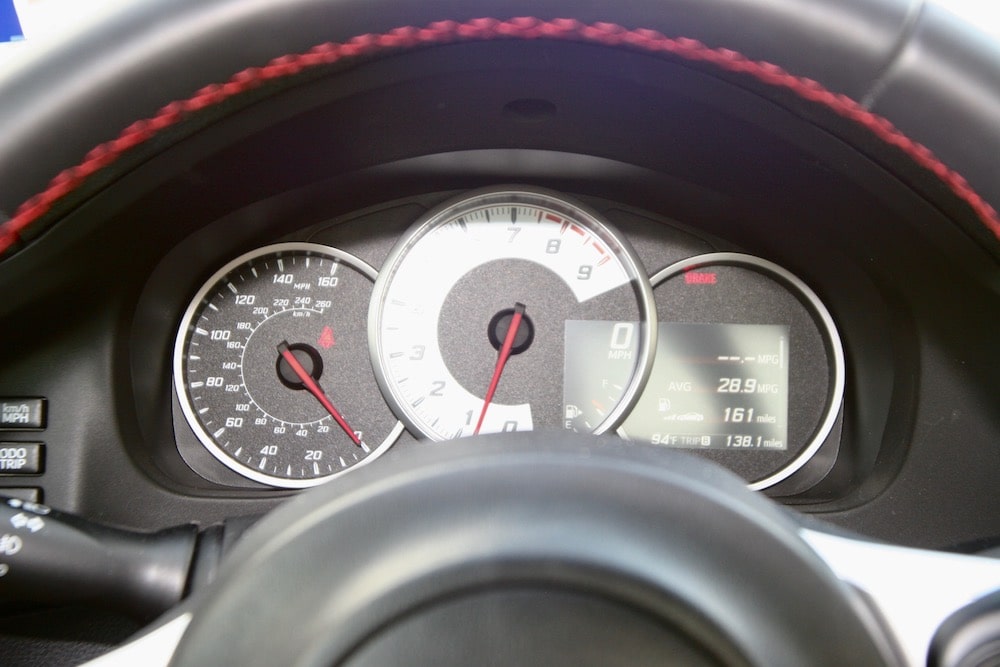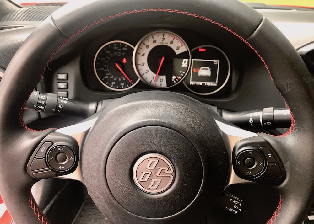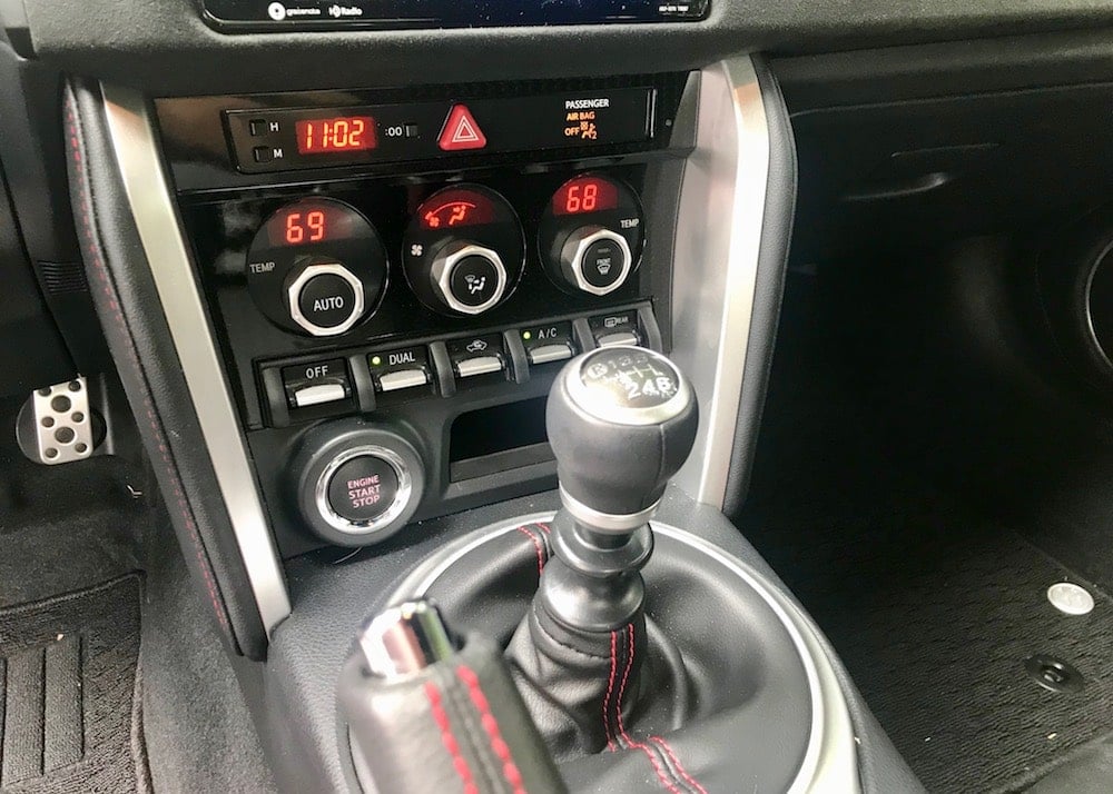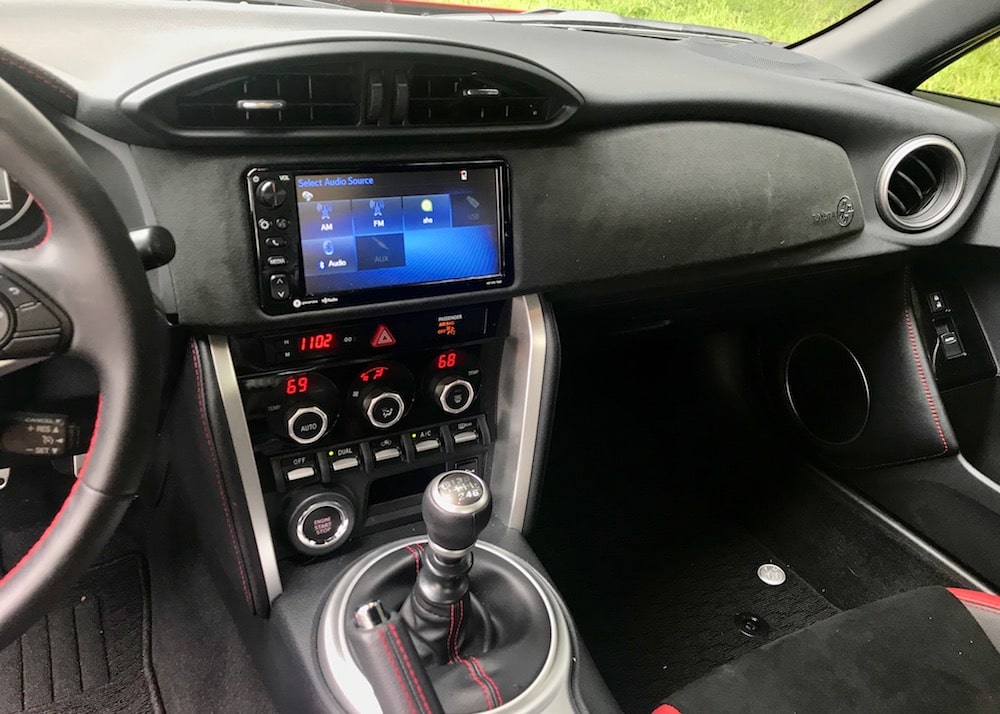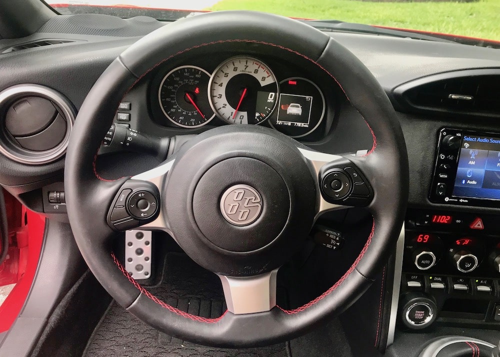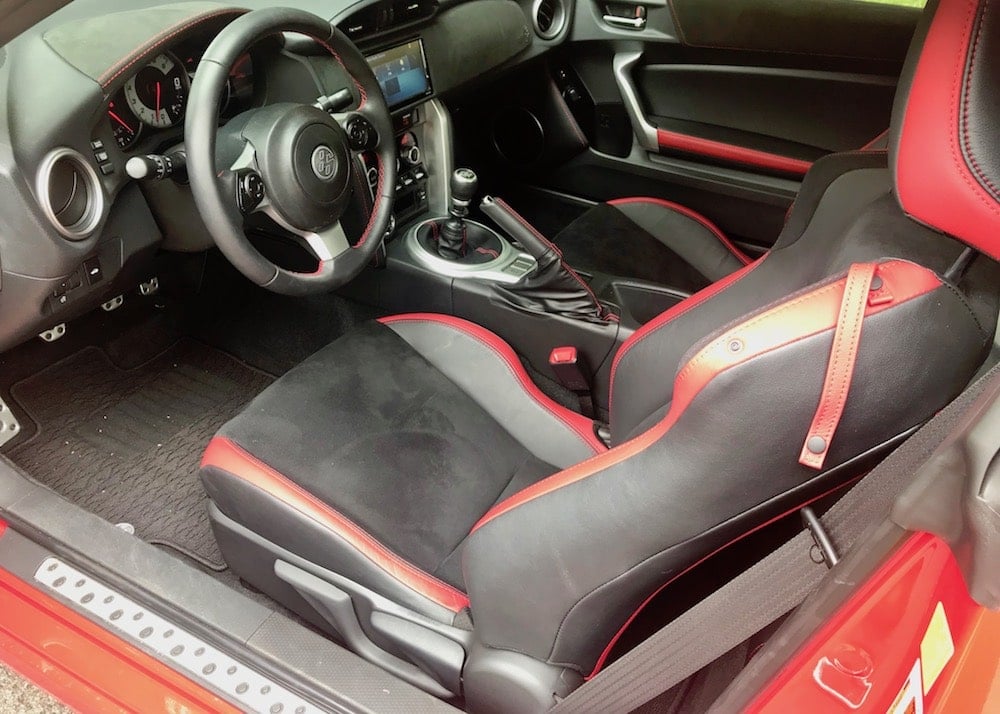 My 86 GT tester’s interior isn’t the most modern-looking on the block, but I can’t imagine it any other way. The black and red accented interior looks the part with comfortable sport, leather-trimmed bolstered bucket seats, no-nonsense toggle controls and a nice faux suede material that accents the door panels with embroidered 86 badging. The center console houses a 12V outlet, and a sliding dual cup holder.