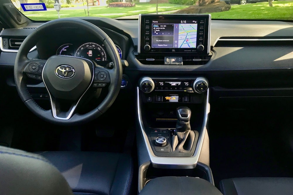 The RAV4’s completely redone cabin features soft-touch materials and blue XSE stitching. SofTex-trimmed heated front bucket seats come with improved heating capabilities. The driver’s side is 8-way power adjustable, while the passenger’s seat gets the short end of the straw and is 4-way manually adjustable. You get a push-button start, along with a leather-trimmed tilt/telescopic three-spoke steering wheel with controls that allow you toggle through info on the 7-inch digital driver display and tachometer. Above, a cool new digital rearview mirror is standard on the XSE HV and Limited trims.