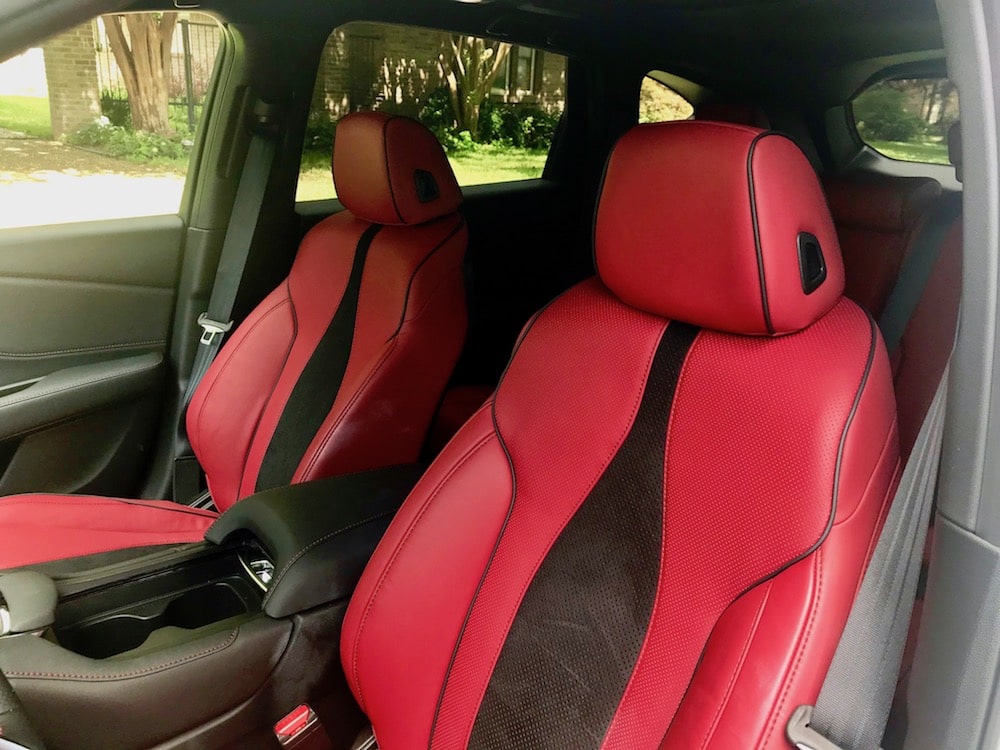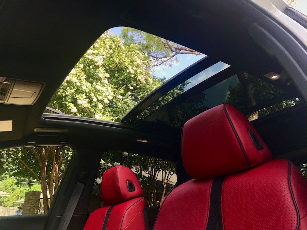 The well-designed and executed interior grabs your attention when you open the door. You’re greeted by A-Spec leather-trimmed sports seats in red with black ultrasuede inserts and there are soft-touch materials throughout the cabin accented by dark brushed aluminum trim and red-ambient lighting. You also cannot miss the ginormous panoramic moonroof.