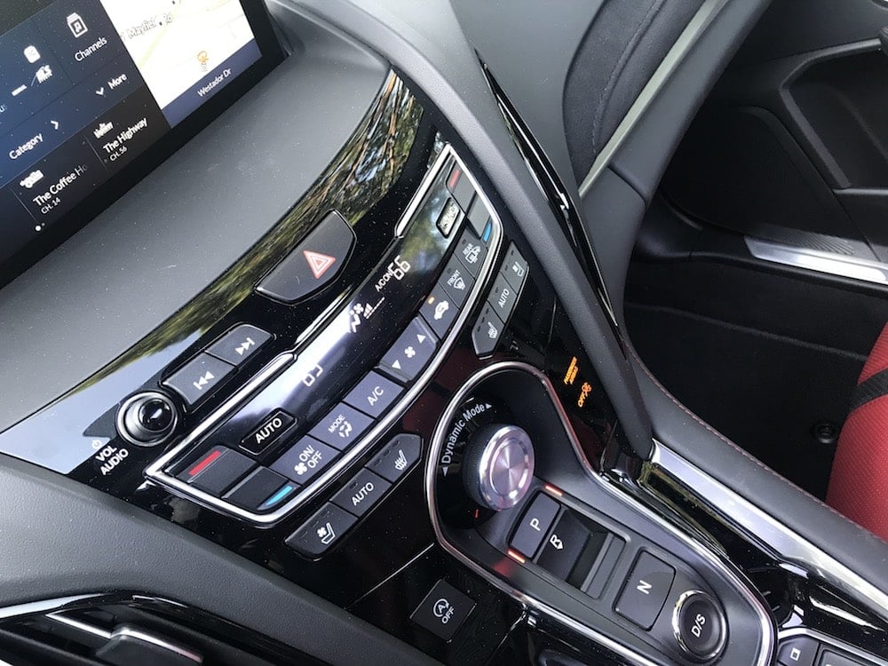 A quality 10.2-inch color infotainment screen sits atop the center stack and houses a multi-view rear camera with dynamic gridlines, standard across the lineup. Underneath it you find dual zone climate controls as well as buttons for heated and ventilated seats. Below that you come to the dynamic mode knob as well as a button to turn off the stop/start system --- which, by the way, is more noticeable in this vehicle than in others I’ve driven. While it doesn’t bother me too much, it may some. The center stack also houses an electronic gear shifter, which opts for buttons instead of a traditional lever gear shift. I find it very easy to use. The center console cover hides 2 cup holders, a fair amount of storage space, and one of four USBs in the cabin.