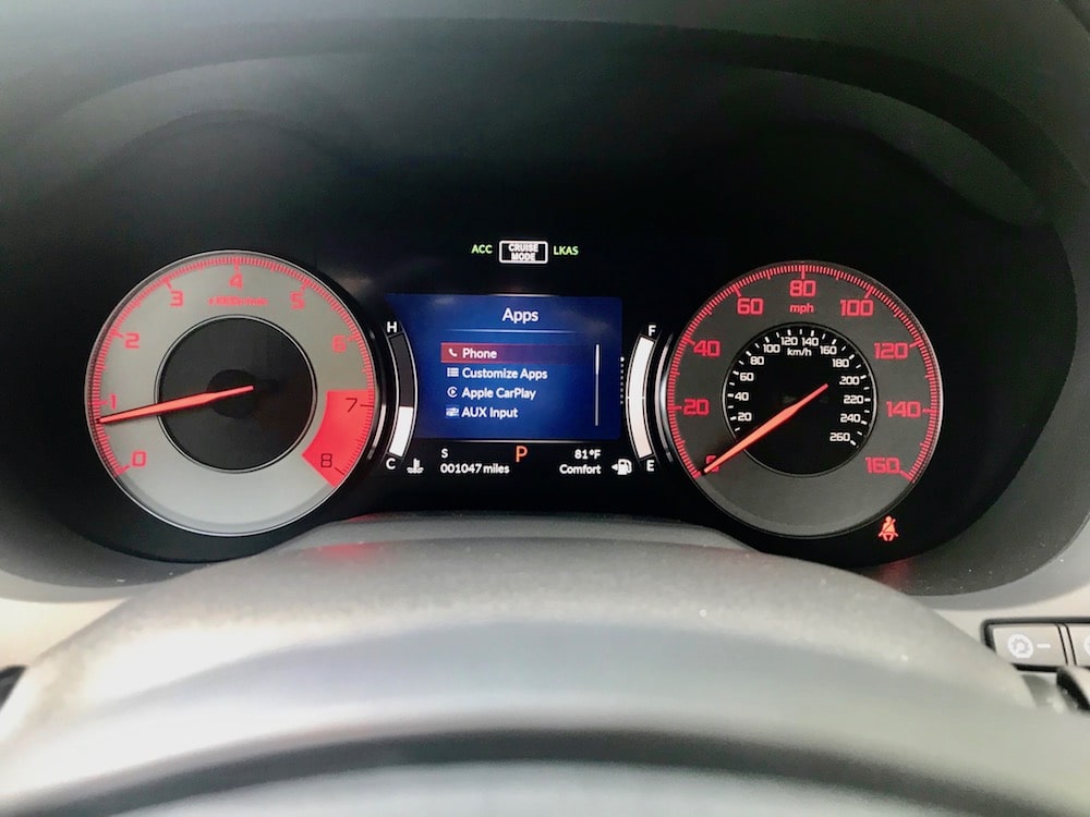 The 12-way power heated and ventilated seats feel great. They’re sporty with some side bolstering yet not too firm. An A-Spec badged steering wheel with mounted controls is leather-wrapped as well as heated. Press the push button start and it lights up a bright, A-Spec exclusive red-accented digital and analog tachometer with a 7-inch driver display.