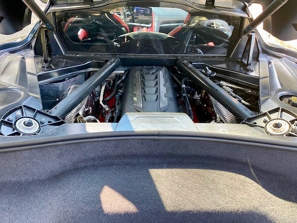 The C8 has a trunk in the front called a “frunk” that will carry a good amount of cargo and there is more room in the engine compartment. If you take the targa top off, it will fit snugly and latches in the rear area for safe keeping. The rear hatch is soft close; just barely put it down and it will close itself.