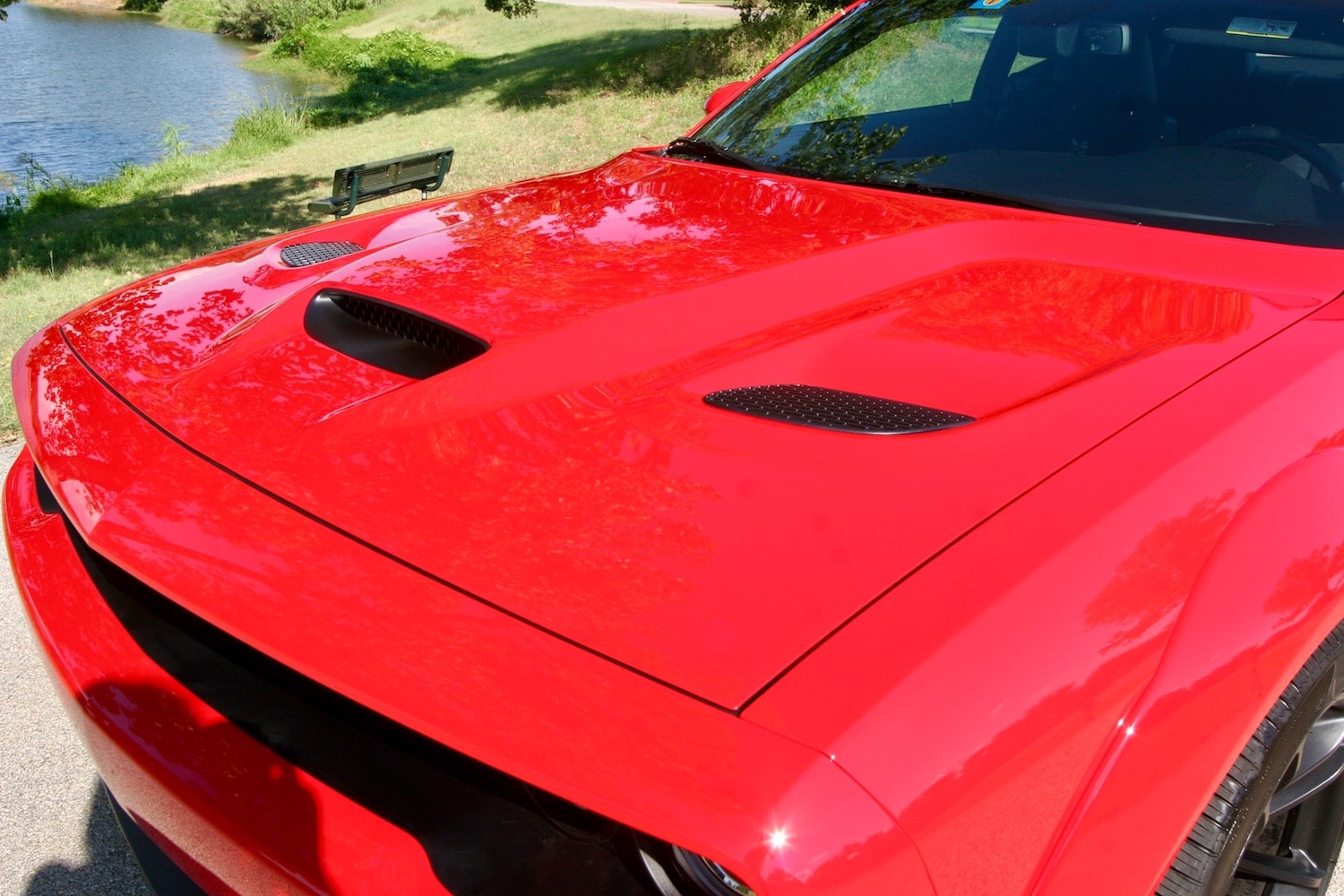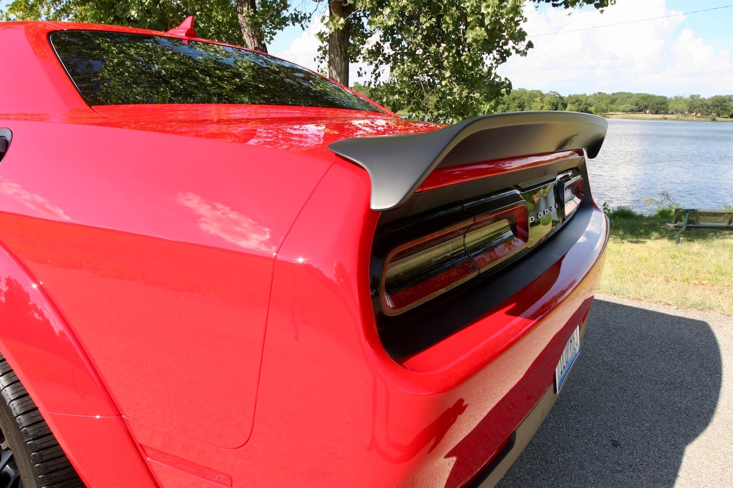The Challenger, especially in Widebody form, is a commanding presence on the road with its long functional hood, huge fenders and upgraded 20-inch black carbon aluminum wheels that mean business. The exterior gives off a ‘60s and ‘70s muscle car vibe in all the right ways. This TorRed model features Scat Pack 392 badging, a black SRT grille and larger front splitter. The double circular headlamps are so cool. Also love the classic script Challenger badge up front on the grille. Note that fog lamps are not available with the Widebody. In back, you find LED brake lights, dual rear stainless steel exhaust and an optional satin-black SRT Performance spoiler.