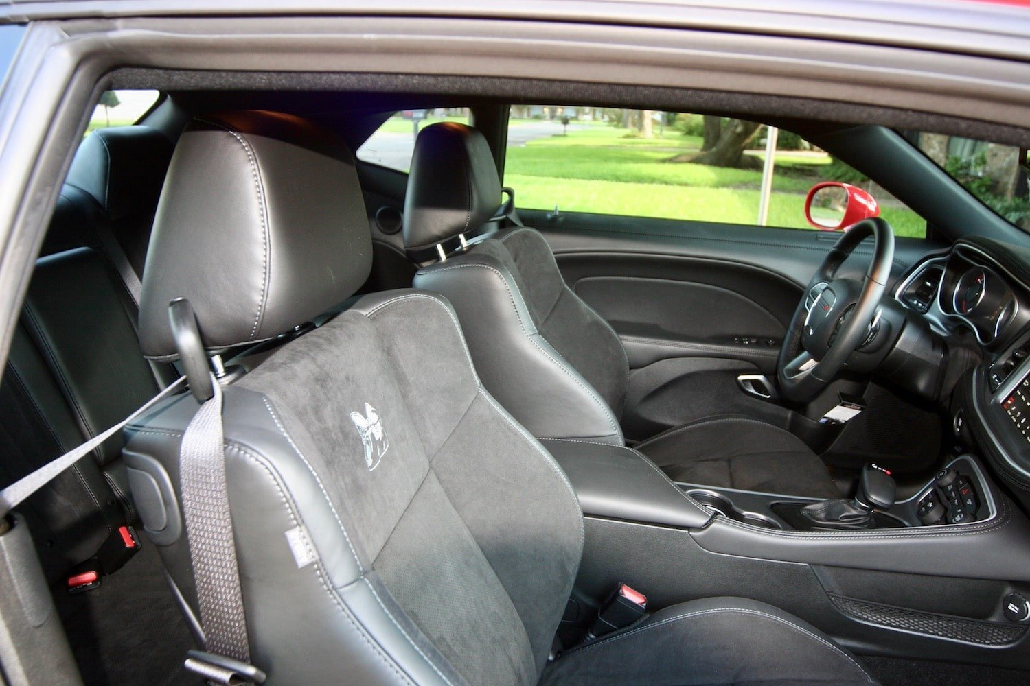 You open the door to a roomy all-black, interior with a simple, user friendly, layout. This has the optional Scat Pack Nappa leather and faux suede inserts with the Scat Pack logos on the seat backs. They are comfy with sports bolstering that’s not too tight.