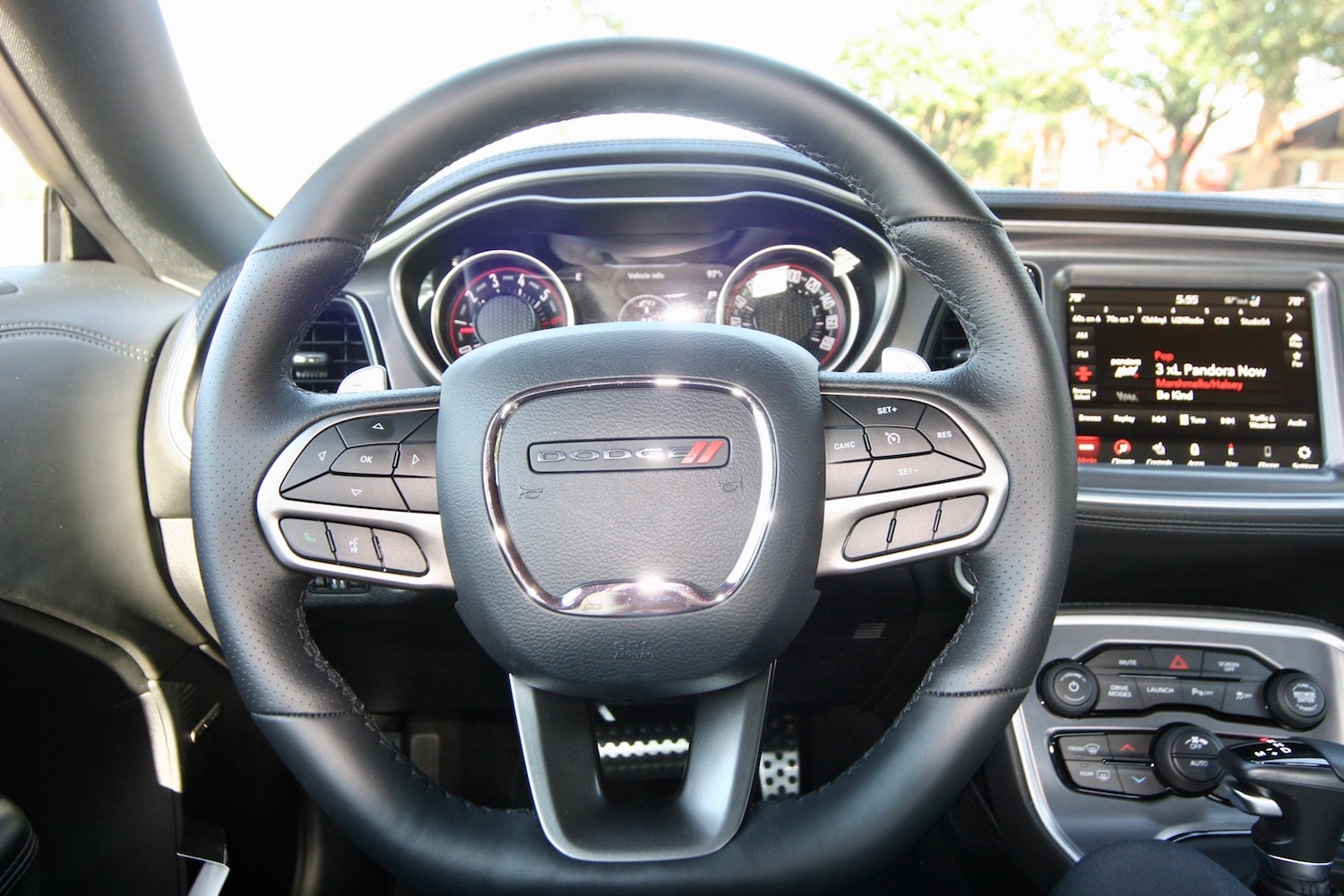 The Challenger is surprisingly easy to maneuver and get around in despite its size with the extra 3.5-inches of width due to the $6000 Widebody package. It doesn’t feel like a boat to drive and I had no trouble taking it through the car wash. Performance wise the Widebody package also adds adaptive damping suspension, ABS brembo 6-piston front brakes up front, with four-piston brembos in the rear. Inside you’ll get a leather flat-bottomed steering wheel, and a performance shift indicator.