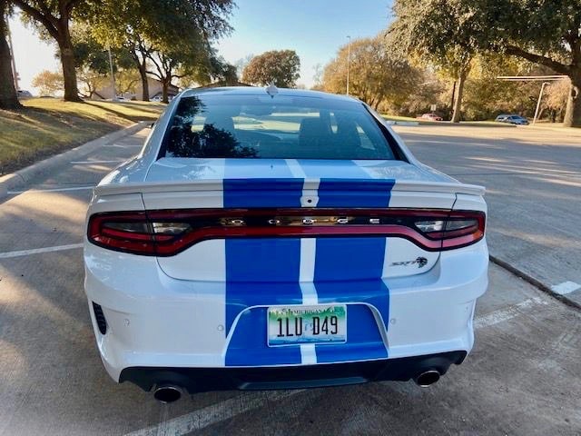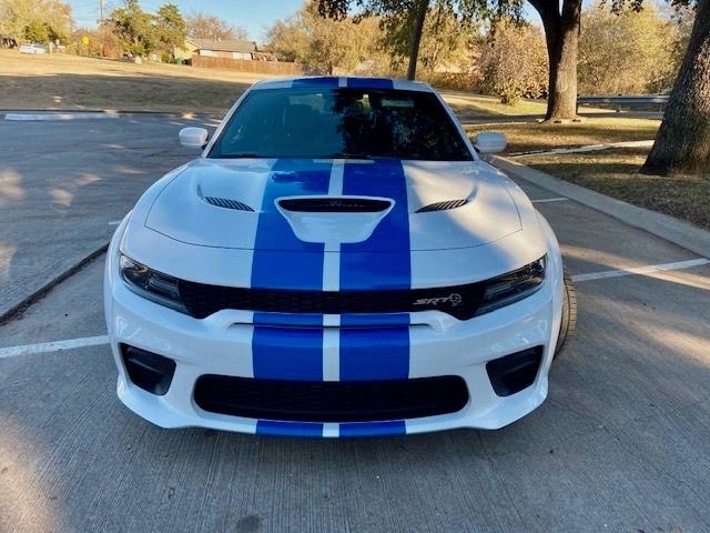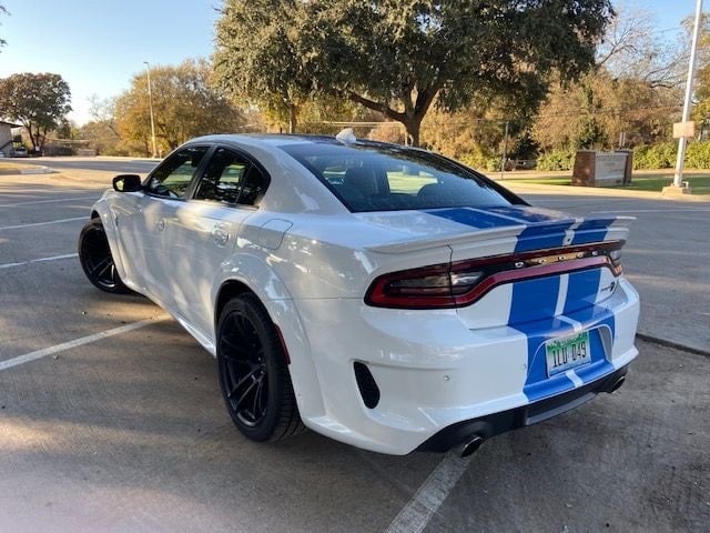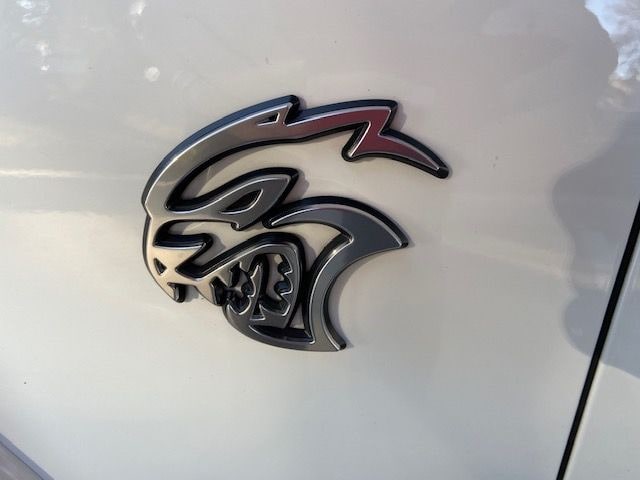 This color is appropriately called White Knuckle and it has blue full-body stripes. The Hellcat emblem on the front fenders lets people who pull up next to you know what you are driving, and typically they show the proper respect for one of the fastest cars on the road.