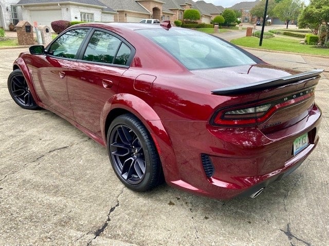 The Charger only comes with an 8-speed shiftable automatic transmission. The Scat Pack sits on 20” by 11” wheels and Pirelli tires that look terrific, and you can’t miss the massive red brake calipers. The Widebody gives you another 1.5” width on the tires