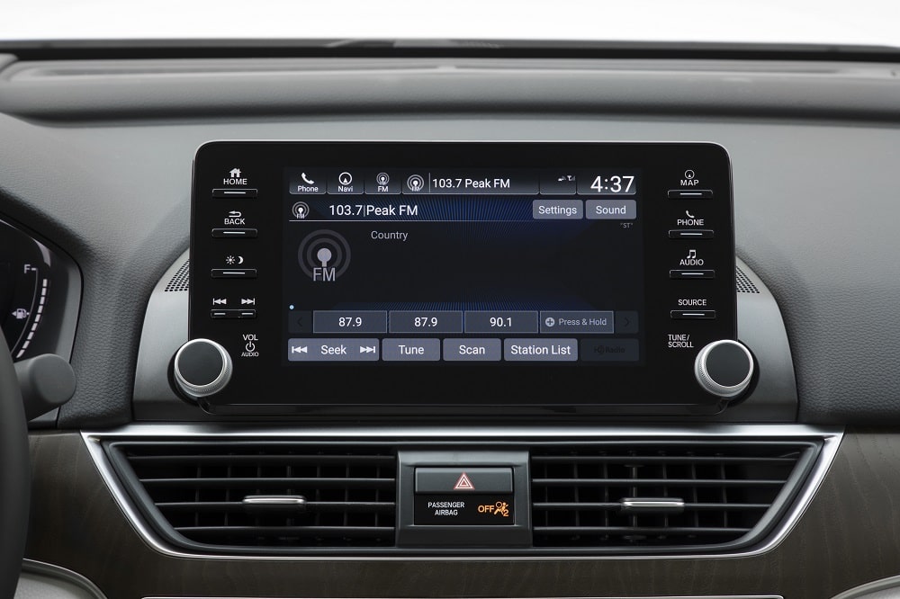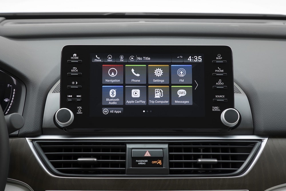 A deep black dashboard in the Accord curved gently down onto a mid-dash anchored by a horizontal tablet-shaped display screen with navigation, voice recognition, rear cross-traffic monitor and Apple CarPlay/Android Auto integration.