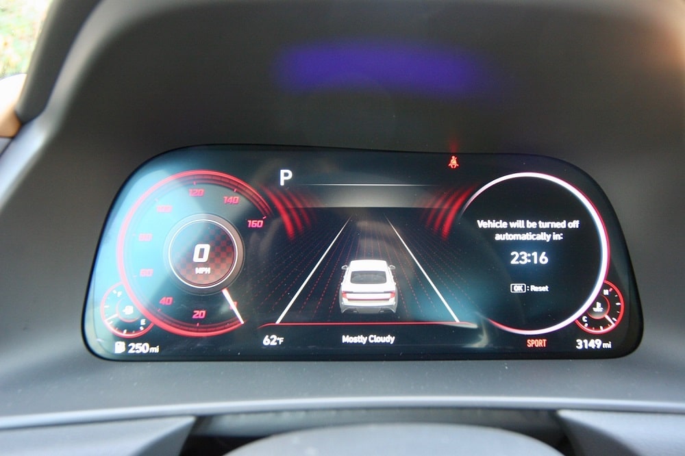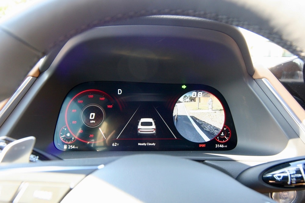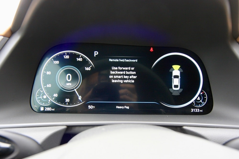 Technology is exceptional in the Sonata. The 12.3-inch cluster is digital, bright and easy to read. The weird thing is that the speedometer and tachometer are reversed. The speedometer is on the left side. But what is really cool is the integrated Blind View Monitor. When you use your turn signal, a camera view of your blind spot appears in the middle of the speedometer or tachometer. The Limited is also equipped with a nice color heads-up display.