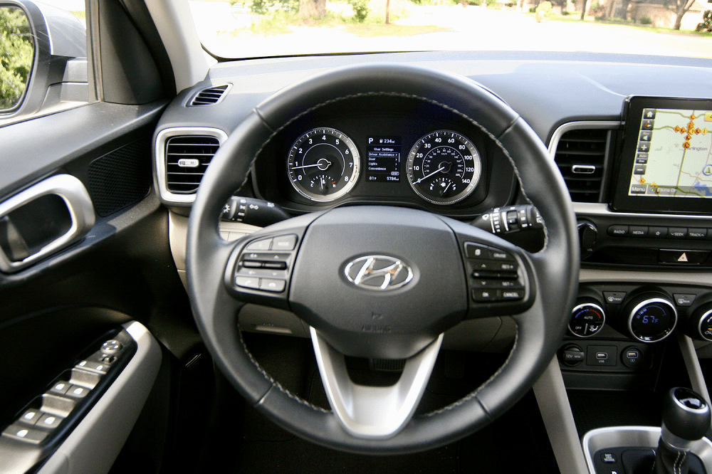 A tilt-and-telescopic steering wheel with mounted controls is standard across the lineup. The Venue’s gauge cluster hosts a small 3.5-inch digital display that gives you driver information.