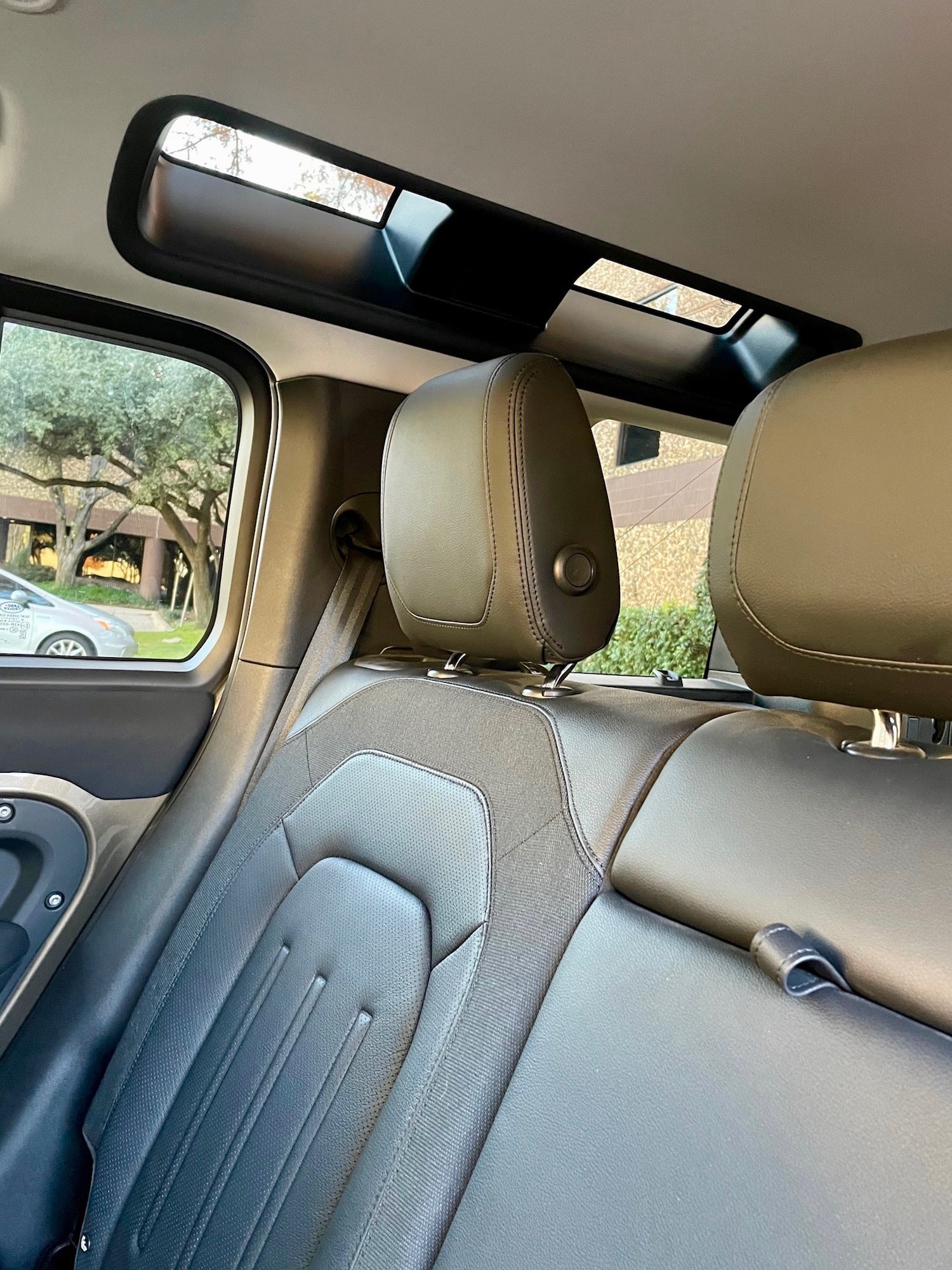 Backseat passengers can control their own temperature and have a slew of power ports and USB ports, along with rear air vents. If you look up, the safari windows give an open and airy feeling, and if you happen to go on safari, you can look up to see the tall animals. There is a blind spot monitor on the rear doors, so if you go to open either one and a car or cyclist is coming, it will warn you. Brilliant!
