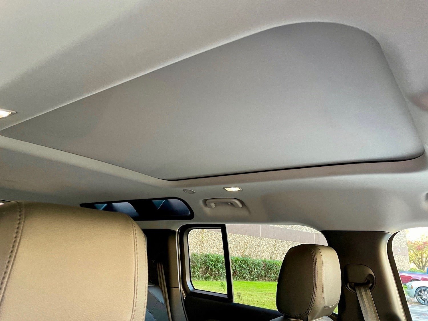 Outside the Defender is square and boxy like the original, but with beautiful 19” black gloss wheels, circle headlights, and large vertical taillights with two small square lights-on each side that work in conjunction with the regular rear lights. This is a throwback to the original Defender. The tall roof has safari windows at the top and on the side, there are matching color plates on the side windows. If you choose some of the optional side accessory packs, they go there. These plates are hard to describe but they look pretty neat.