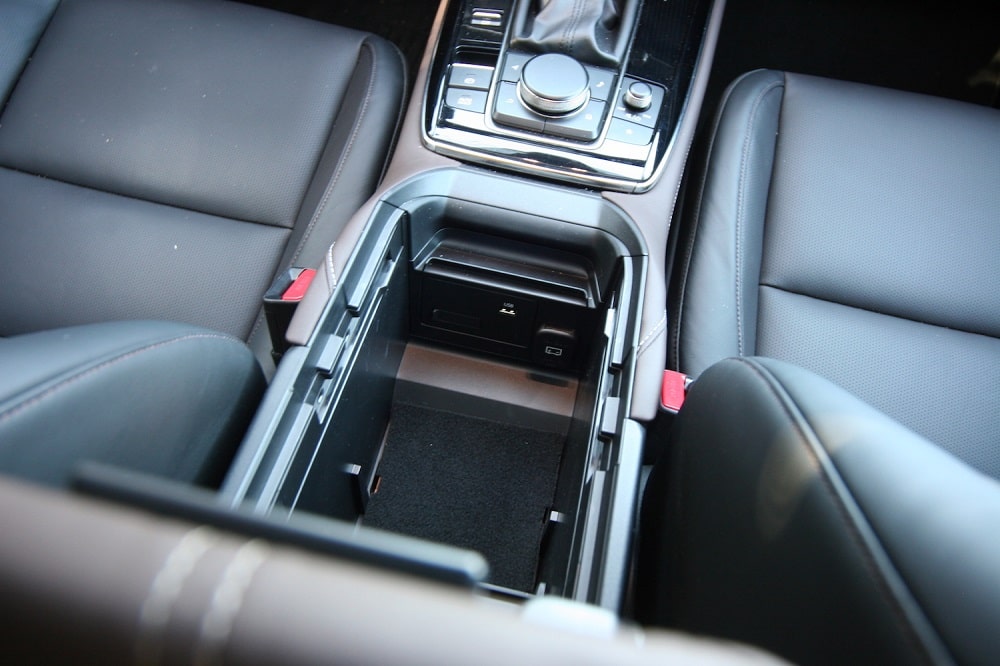 Below the dual zone climate controls, a well-designed glossy black center console is home to a leather-wrapped gear shifter, a switch for sport mode and buttons for the automatic electric parking brake and brake auto hold. The main event is the large round dial for Mazda Connect and a smaller volume knob to the right. The slide-to-open center console bin reveals a USB and 12 Volt.