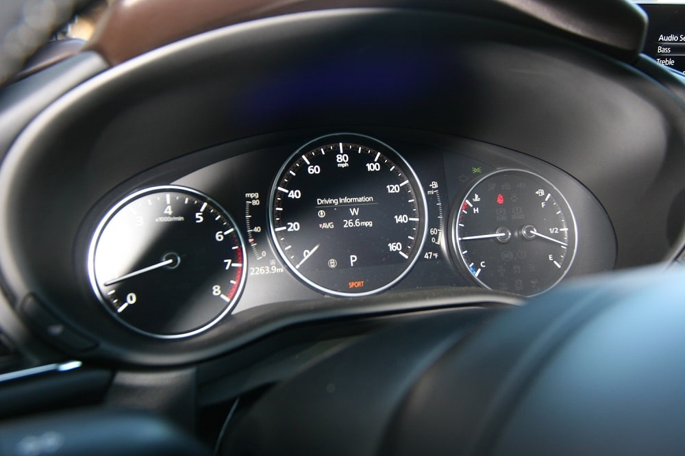 A SKYACTIV-G 2.5-liter 4-cylinder shared with the Mazda3 delivers 186-horsepower and matching 186 lb.-ft. of torque. Horsepower felt fine for its size and weight, but the 6-speed automatic transmission shifts too slowly for my taste and hinders initial acceleration a bit, though once past that I had no complaints. All-wheel drive is optional and the top trim exclusively features AWD with a cylinder deactivation system that improves MPG by one.