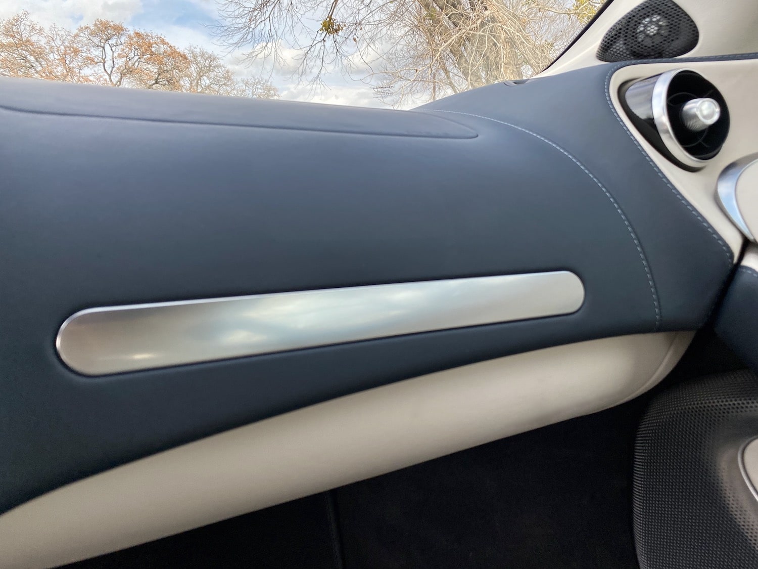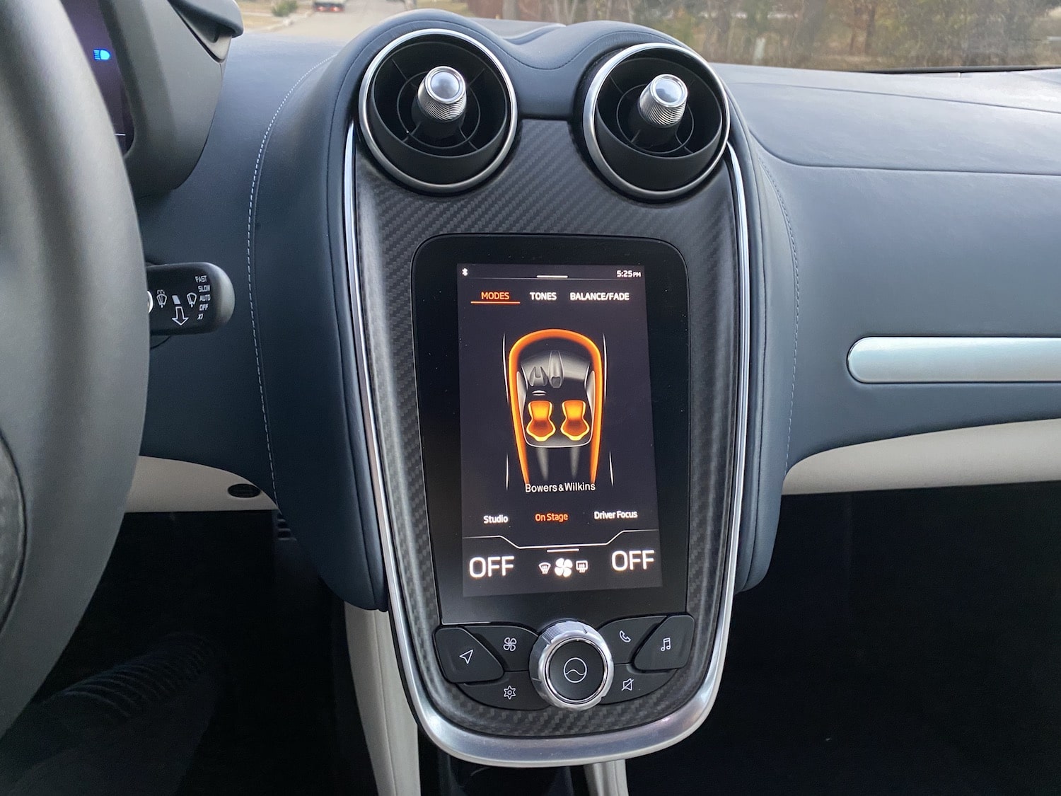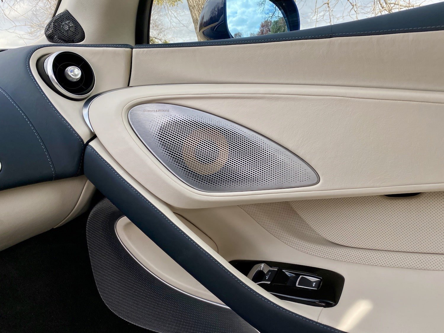 The glorious Dihedral doors open to reveal a driver centric, modern, and luxurious cabin. This model features the Luxe Porcelain & Ink Blue Soft Grain Aniline Leather-trimmed interior, complemented by machined aluminum switches and controls, satin silver and piano black accents. An optional 12-speaker Bowers and Wilkins system features speakers with a new grille design. A second MSO package adds some carbon fiber pieces. But you won’t find carbon fiber seats in here. The power, heated “Comfort” leather seats are designed for road trips. The leather dash and door panels are impeccably crafted as well. Carbon black carpet adorns the floors.