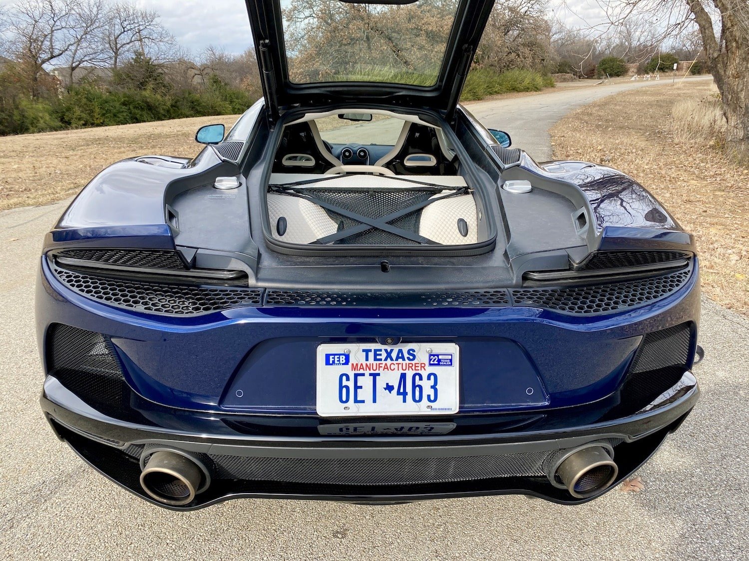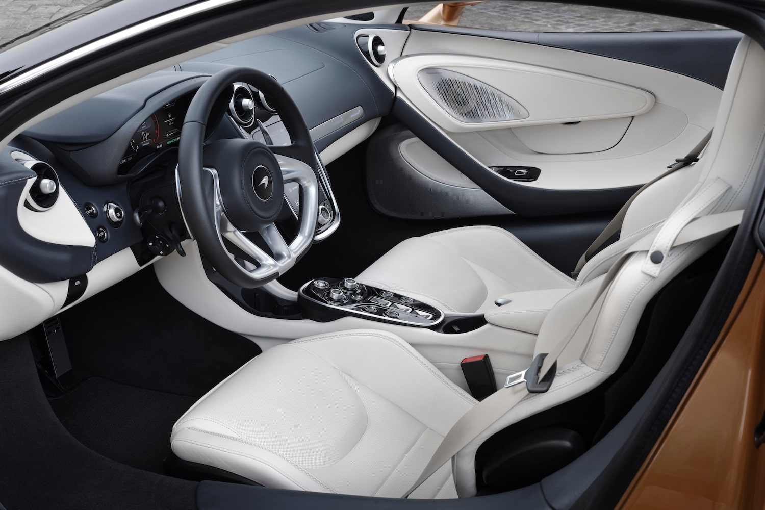 The GT is built on McLaren’s lightweight carbon fibre MonoCell-II T chassis. It’s longer than other McLarens (at over 15 feet long) and weighs just under 3,400 pounds. The GT sits low to the ground and an optional front-end lift helps with ground clearance in steep situations.