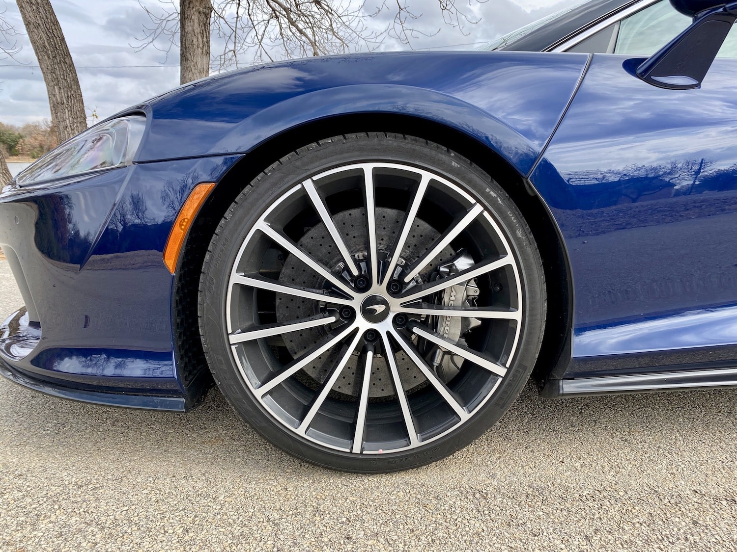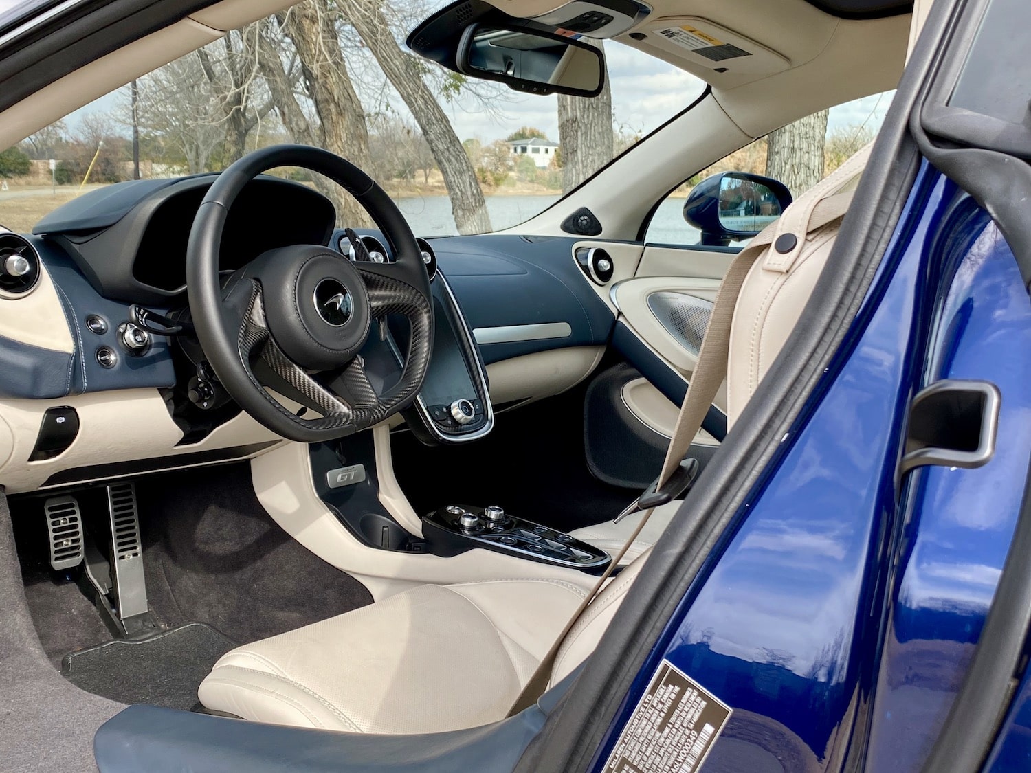 Don’t even try to go incognito in this stunner. It’s gorgeous and quite an attraction for anyone fortunate enough to be in the vicinity. Going along with the GT theme, you note that it’s a more subdued McLaren. For one you have a smaller integrated rear wing. My GT test model is sleek in Namaka Blue and rides on utterly spectacular optional 15-spoke wheels with a Black Diamond Cut Alloy finish that are part of a McLaren Special Operations (MSO) package. 21-inch wheels in the rear, the largest ever fitted to a McLaren, and 20-inch the front. They are absolutely mesmerizing in motion.