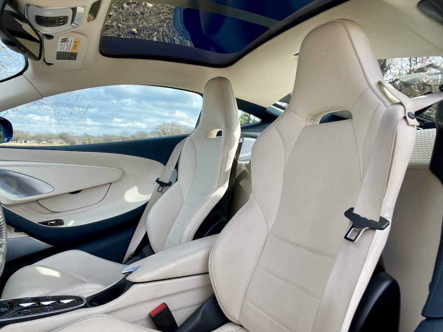 Driving any McLaren is truly an exhilarating and engaging experience and the GT is no exception. It’s low, planted stance gives you a commanding feel of the road. This is also outfitted with optional carbon ceramic brakes and aluminum calipers. Precise performance brakes are confident and responsive. The GT’s double-wishbone Proactive Damping Control system is geared to provide more ride comfort than in other McLarens by predicting and adjusting to the road conditions ahead. The end result is a blend of performance and McLaren’s renowned driving dynamics with a softer, yet still on the sporty-side, ride. You’ll have the crisp handling you want for twists and turns on two-lane roads, and a ride that smooths out on long stretches.