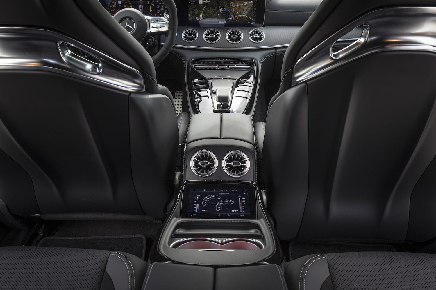 I just let the GT 53’s black interior smooth the rough edges – most of the time. Its upper dashboard, for example -- stitched in soft leather – rolled down to a mid-dash absolutely dominated by two horizontal 12.3-inch screens side-by-side for the instrument panel and infotainment system.
