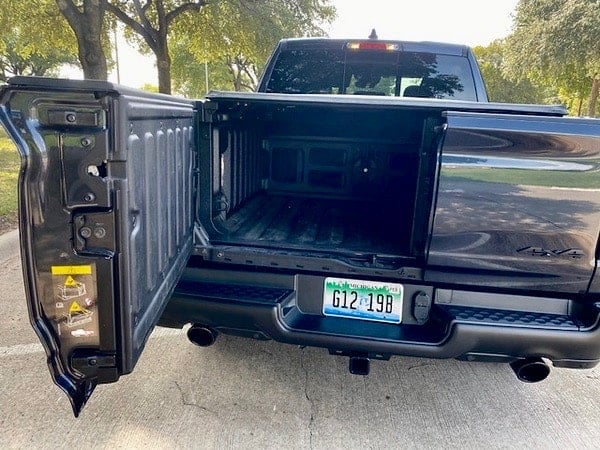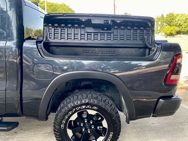 One of my favorite options is the Ram box. They are built into each side of the bed and they are lockable and waterproof. You can buy accessories to hold shotguns, fishing rods, and more. There are plugs in the bottom for drainage if you want to put ice in there, and one of my favorite features is the toolboxes and tailgate all lock when you lock the cab doors.