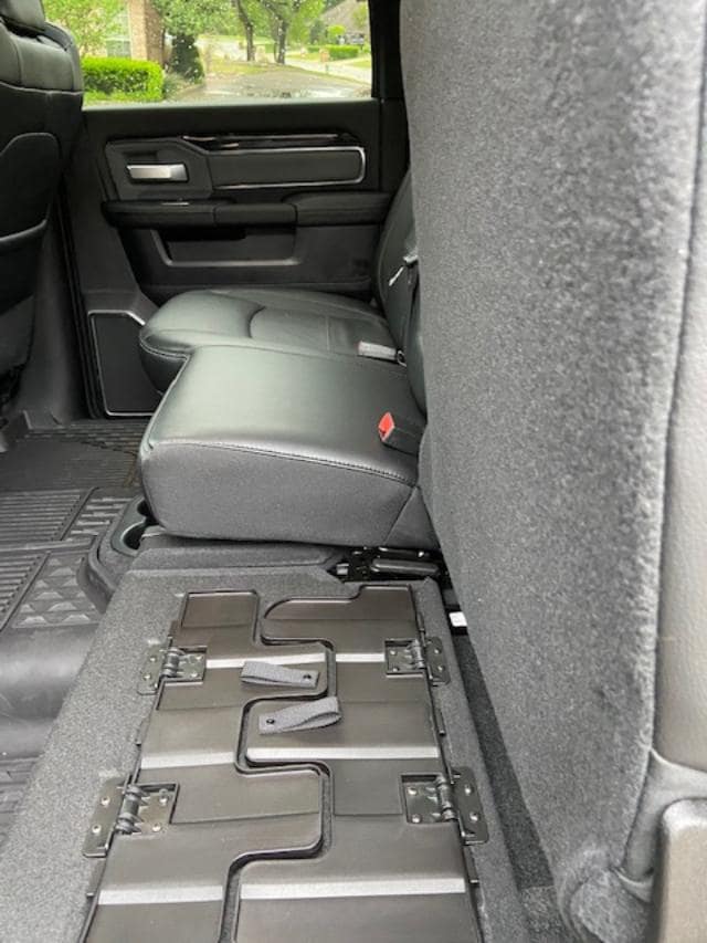 As you move to the inside of the truck, you see a huge interior that will comfortably seat six adults. There is a large fold down center console on the front seat, and one thing I love about the Ram is the way the back seat folds up to reveal in-floor storage bins.