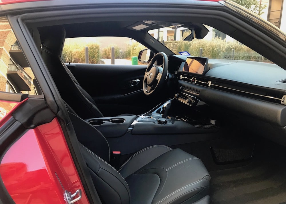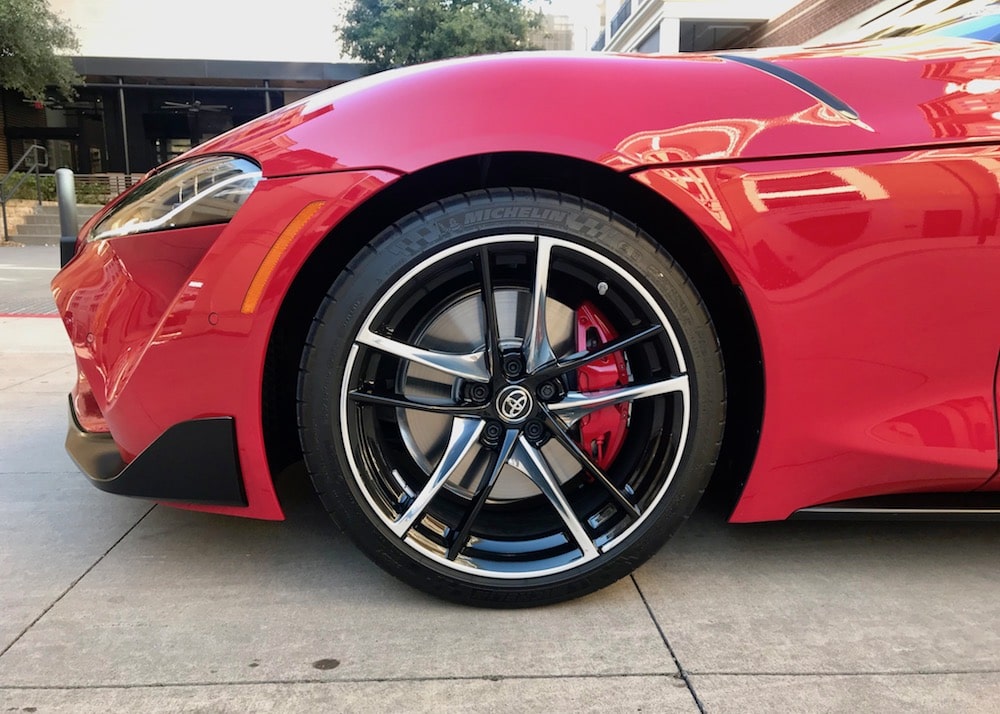 The Supra’s FT-1 concept-inspired exterior with its long hood sizzles in Renaissance Red 2.0 hue. In front, a well-designed two-level six lens LED headlights integrate daytime running lights. But note there are no fog lights. Another thing that’s certainly interesting is that the air vents on the Supra are fake, as in blocked-off and not functional. That seems to be a purposeful move made by Toyota, so if someone wants to modify the engine for more horsepower, they can open them up for more flow and cooling. The Supra’s double-bubble roof, for aerodynamics and interior head room, harkens back to the 2000 GT. In back, a sleek rear end design features thin LED tail lights and rear combination lights, a built in spoiler and dual exhaust with stainless steel tips. Also, gotta love the old-school 90’s era Supra badging. Another cool feature is the racing-inspired reverse light cluster. 19-inch forged-aluminum twin-spoke wheels with dual-tone finish look great and house high-performance Michelin Pilot Super Sport tires with red brake calipers.