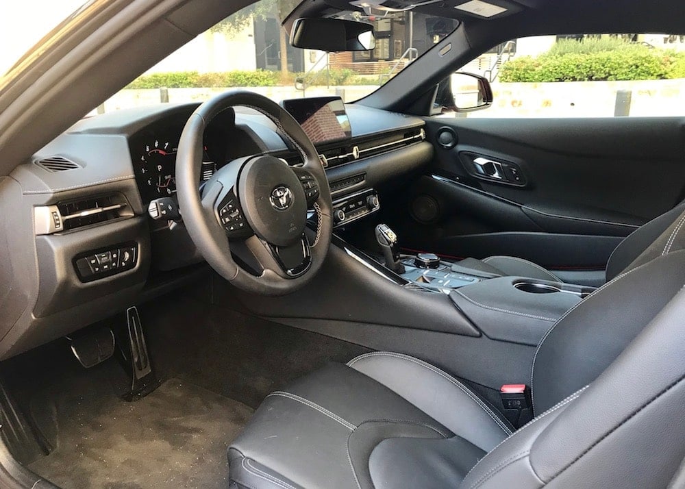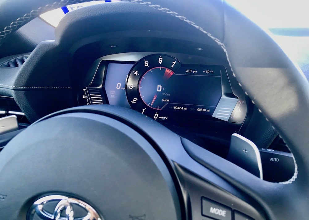 The BMW-sourced 3.0-liter turbo inline-six sitting under the Supra’s hood delivers 335-horsepower and 365 lb-ft of torque, whereas the powertrain in the Z4 M40i makes 382-horses (and 368 lb-ft.) A quick-shifting ZF 8-speed automatic transmission with paddle shifters is outstanding (sorry, no manual in the lineup.) Acceleration feels amazing in the Supra, it’s a thrill ride to say the least, especially when you take it out of Normal and into Sport Mode (that’s also when you’ll hear more engine revs that really amplify the “snap crackle pop” exhaust notes.) Toyota clocks the 0 to 60 time at 4.1 seconds with a top track speed of 155 mph. Stop/Start is noticeable in the Supra, but you can turn it off.
