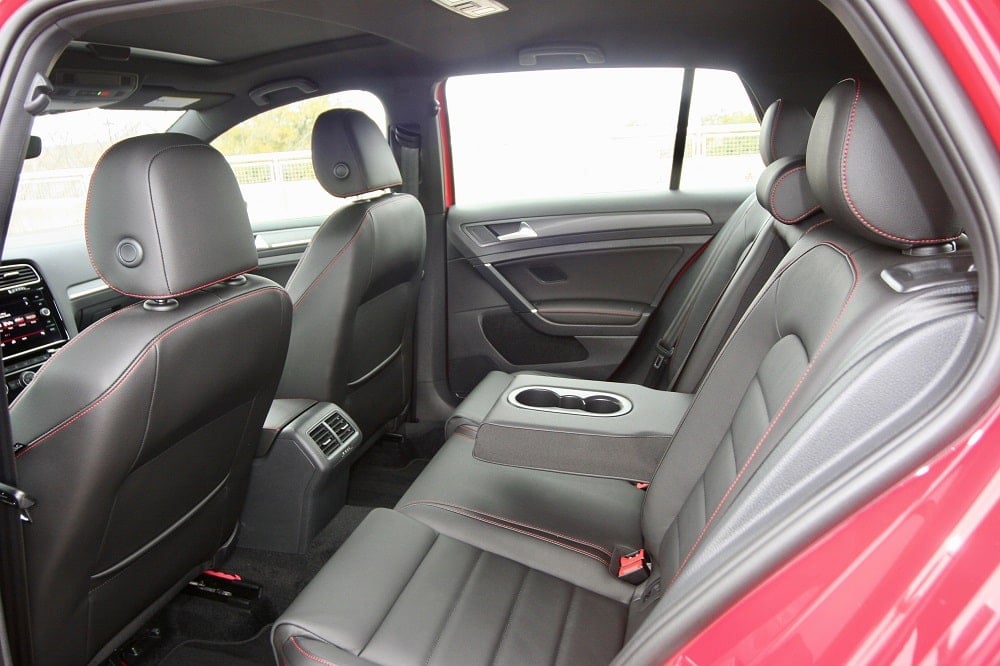 The Golf GTI is roomy and offers a 60/40-split folding rear seat and there’s a middle “pass-through” where you can access the trunk from the second row. The rear seat comes with its own air vents and a drop down center cup holder console. Its hatchback status makes it practical in terms of a nice amount of cargo space. The carpeted cargo area with adjustable floor and a 12-volt power port. You’ll also get red ambient interior lighting in here, illuminated door sill scuff plates and stainless steel pedals.