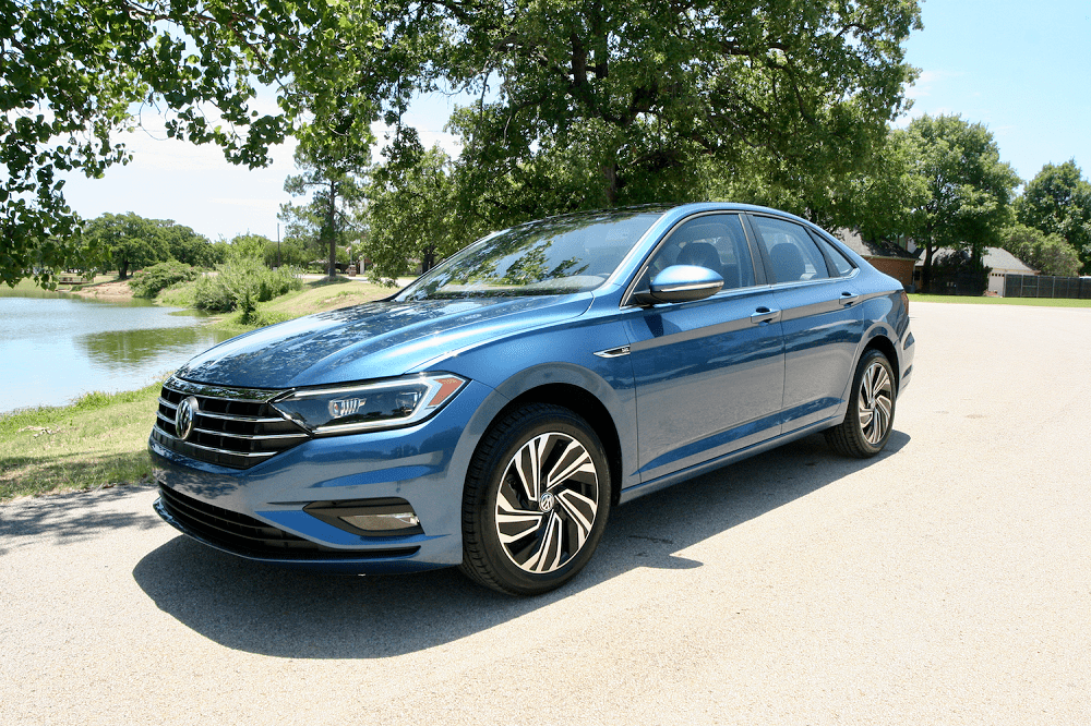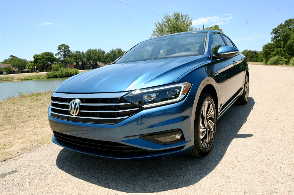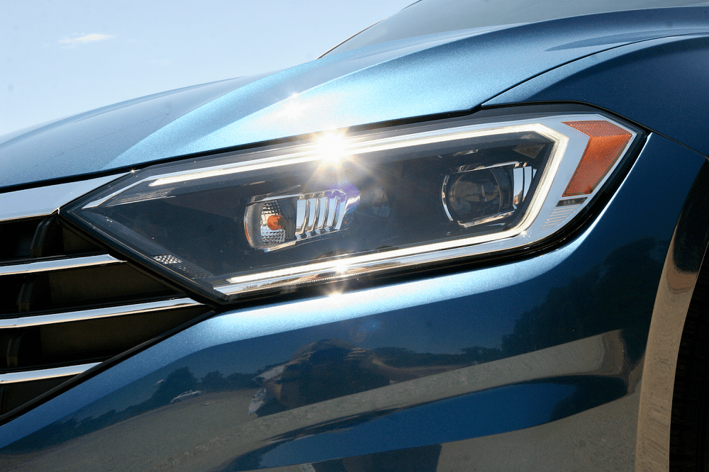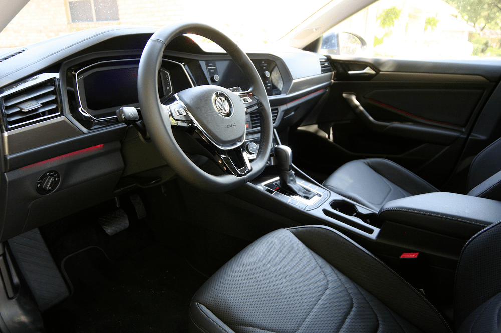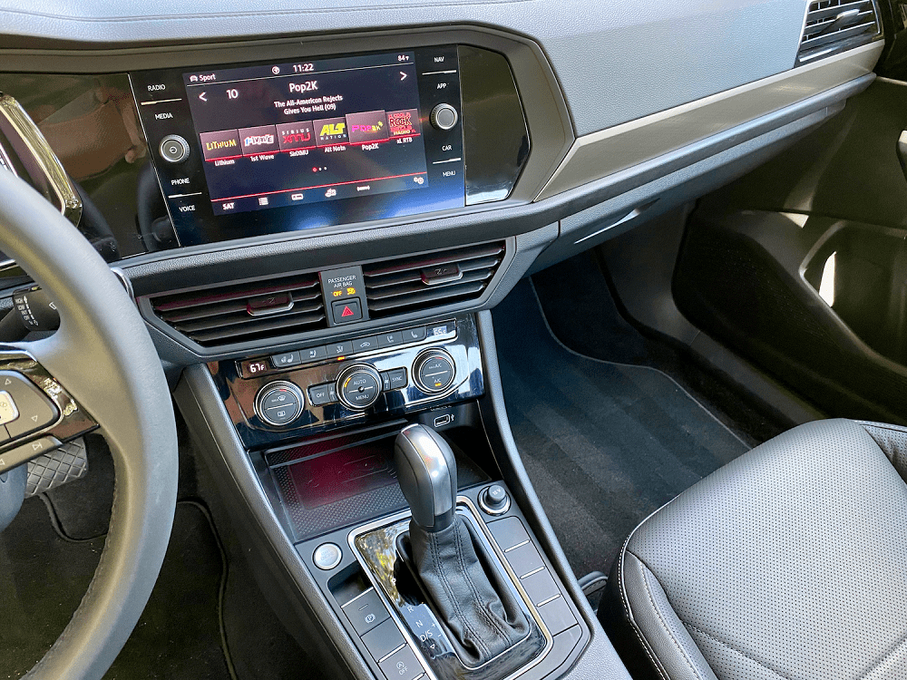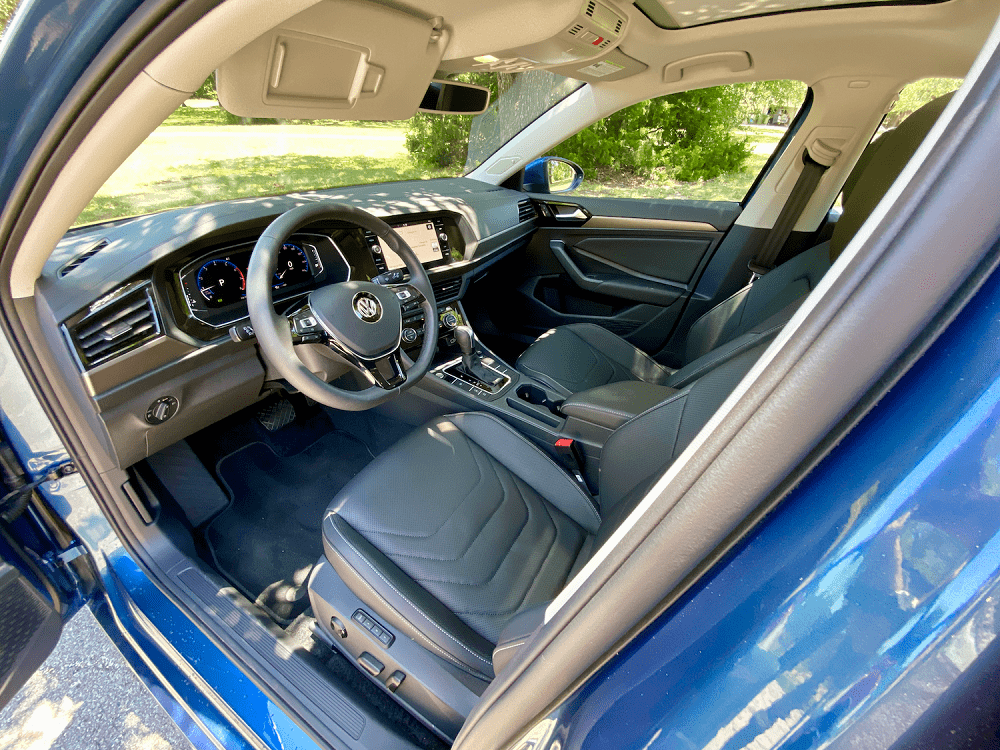 The Jettas 2019 redesign gives it a much more distinctive and bolder look with its long, wide chrome grille. The Jetta also brings in a few design elements from the current-generation Audi A3 with its elongated LED headlights and taillights and with similar strong lines on the profile. My tester’s Blue Silk Metallic hue really does it justice as does my trim’s 17-inch aluminum-alloy wheels. Dual exhaust tips are for looks only. Other exterior features include power-adjustable, manual sliding and heated side mirrors, a power panoramic sunroof, and rain sensing front wipers with heated washer nozzles.