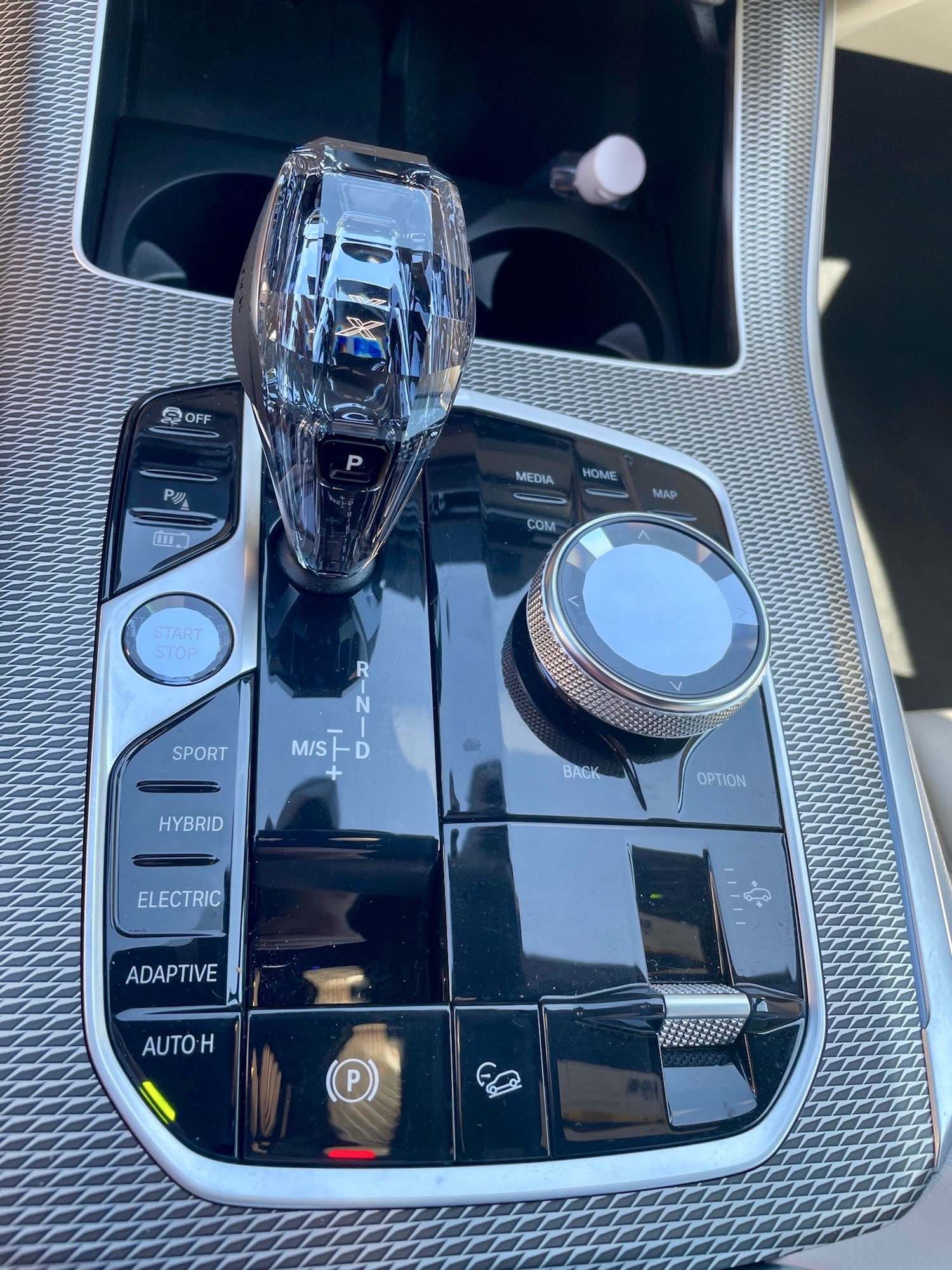 The center console is a work of art starting with the glass handle of the shifter. You can choose the different drive modes, adjust the height of the vehicle, turn on the awesome Auto Hold, and there is a round dial to operate the IDrive system for the sound system, the navigation system, Apple CarPlay or Android Auto and a host of apps. There is also a wireless phone charger as well.