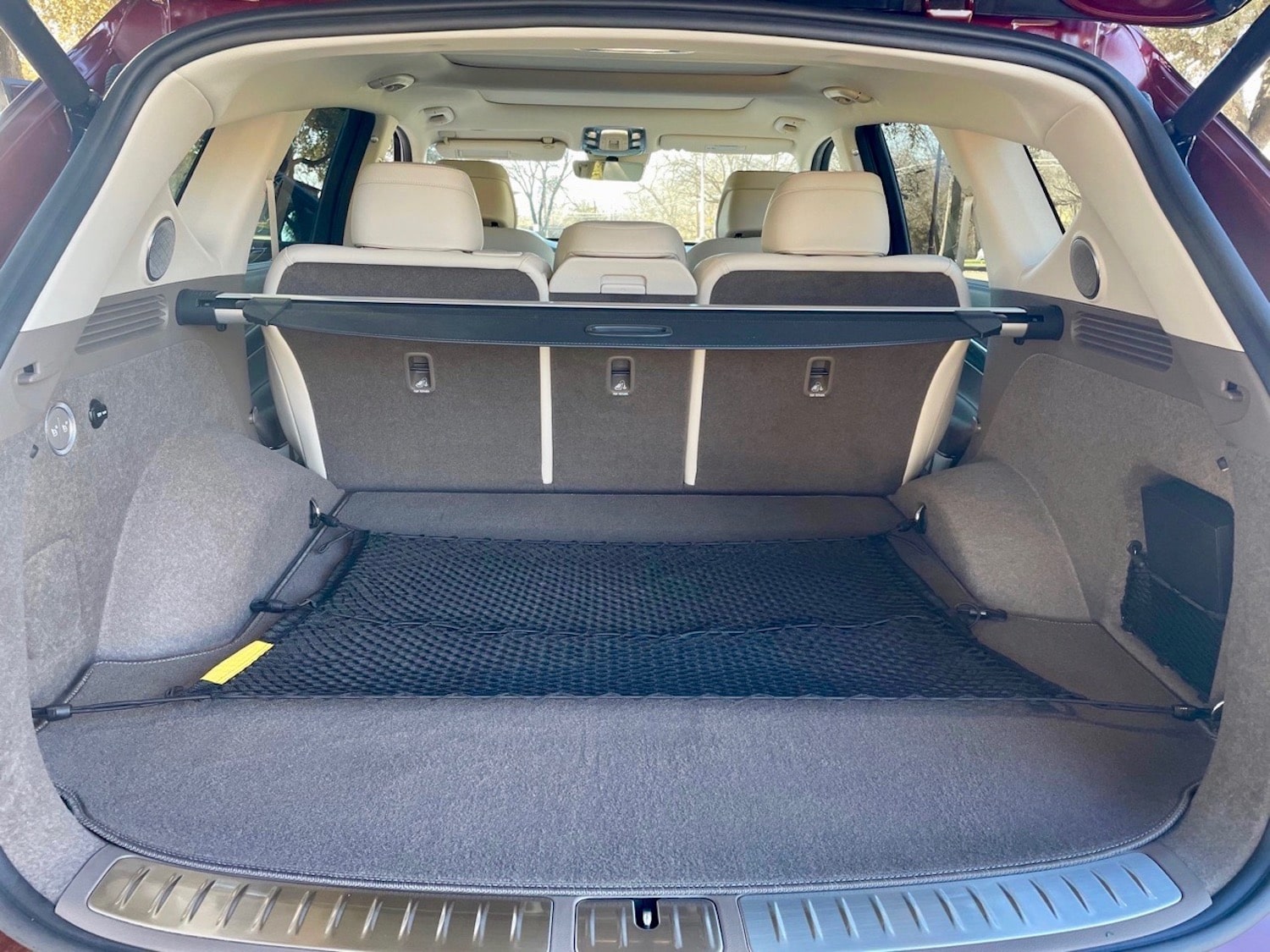 On the gauge cluster, when you turn on your blinker to change lanes either direction, you get a wide-angle camera view from the right side of the gauges to make sure it is safe to change lanes. The center console is surrounded by real wood and houses a rotary shifter, as well as drive modes featuring snow, eco, comfort, custom, and my favorite, Sport mode. There is also an auto hold button which is a feature I truly love.