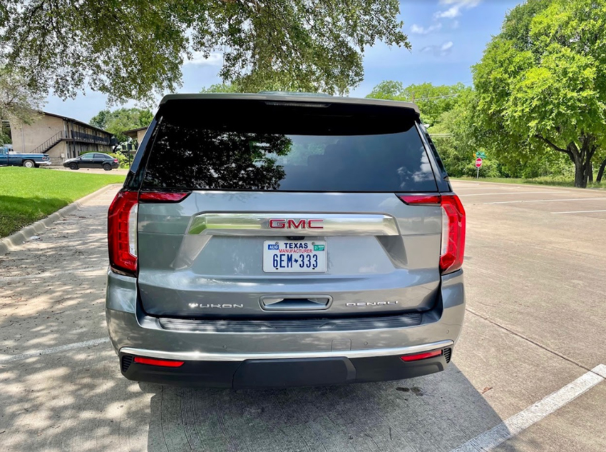 Starting with the exterior, the 2021 Yukon Denali has the familiar squared GMC Professional Grade look. It has 22” wheels that really set it off, the big GMC grill, and the use of a lot of chrome along the sides. A spoiler and dual exhaust set off the rear view.
