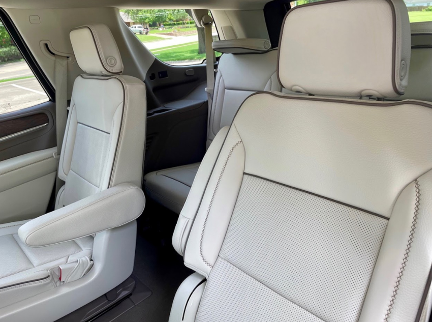 Moving to the second row of seating, this one has heated captain’s chairs with armrests that are super comfortable and they slide and recline. Rear passengers can control their own temperature, USB ports, and a 110-volt power outlet.