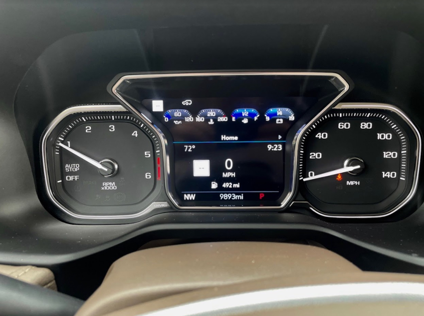 From the driver’s seat, you see a large speedometer and tachometer and gauges across the top that are easy to see. There is a highly configurable driver info center that you scroll through from the steering wheel.