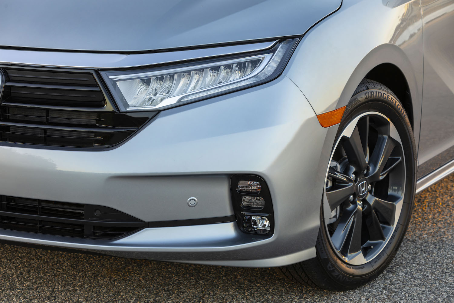 Like all new Hondas, the big minivan greets the world with a clean, horizontal grille flanked by contemporary headlamps and topped by a relatively short, sloping hood.