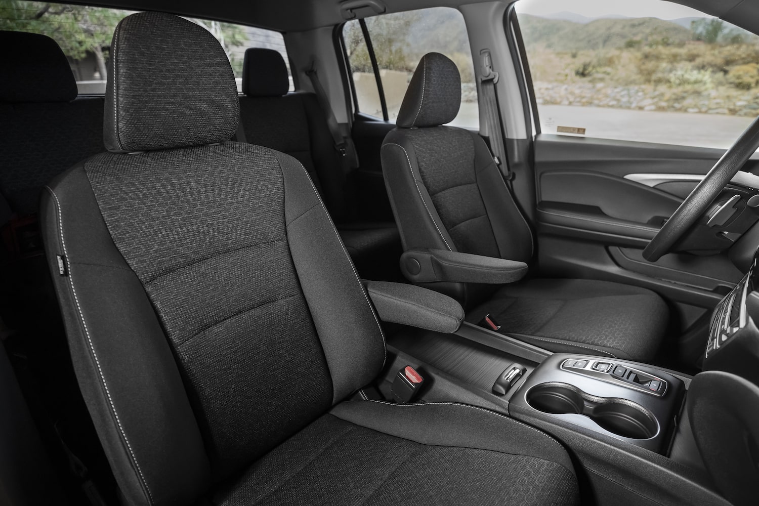 Inside the Ridgeline Sport, you’ll find cloth seating in front that is comfortable and has fold down armrests for both the driver and passenger, but no power seat on either side. There is minimal stitching on the door panels and the seats, and there were more soft touch materials than I expected to find.