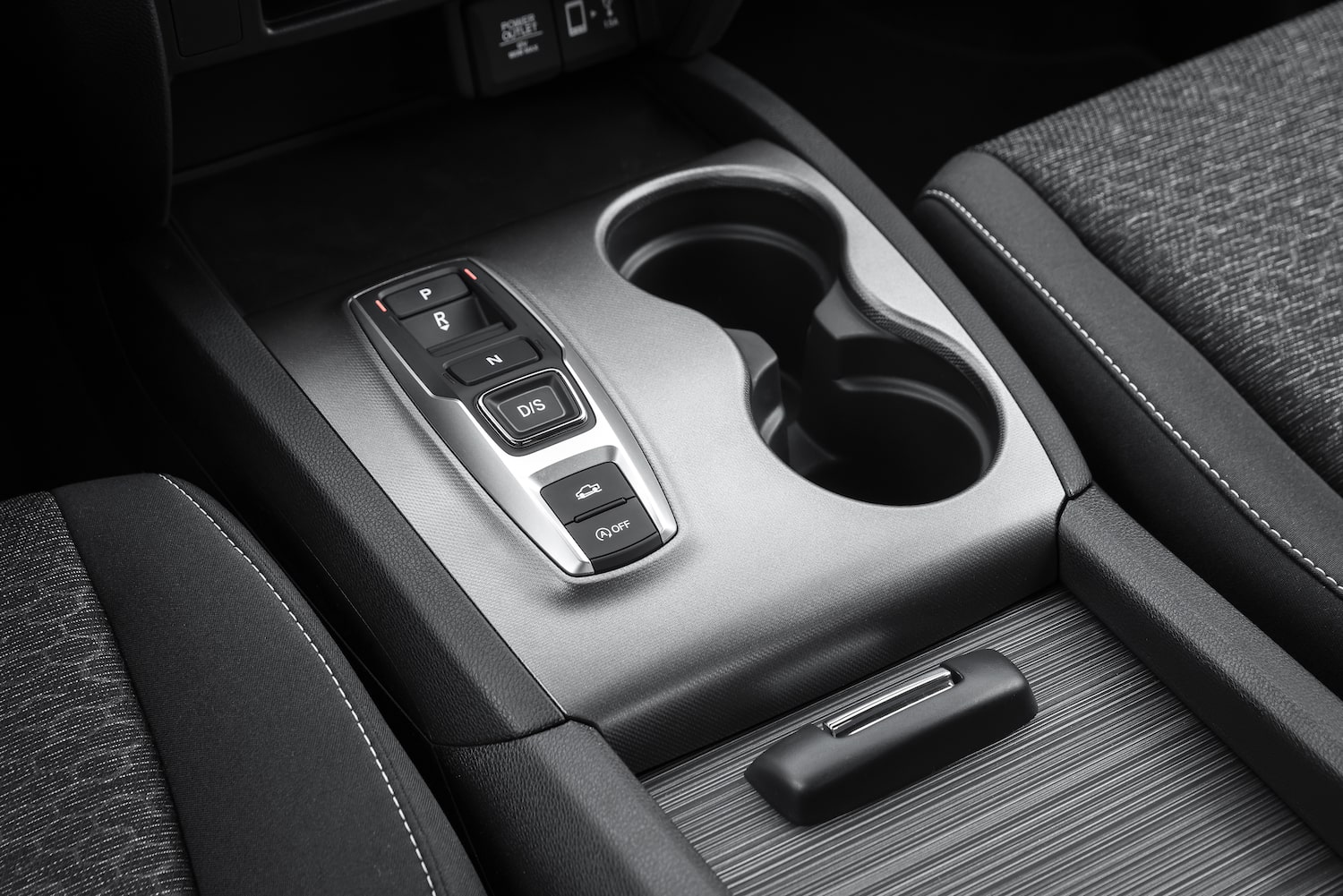 The center console has buttons for the transmission, a couple of cup holders, a power outlet, and you can turn off the start/stop system. There is also a huge storage area with a sliding cover.