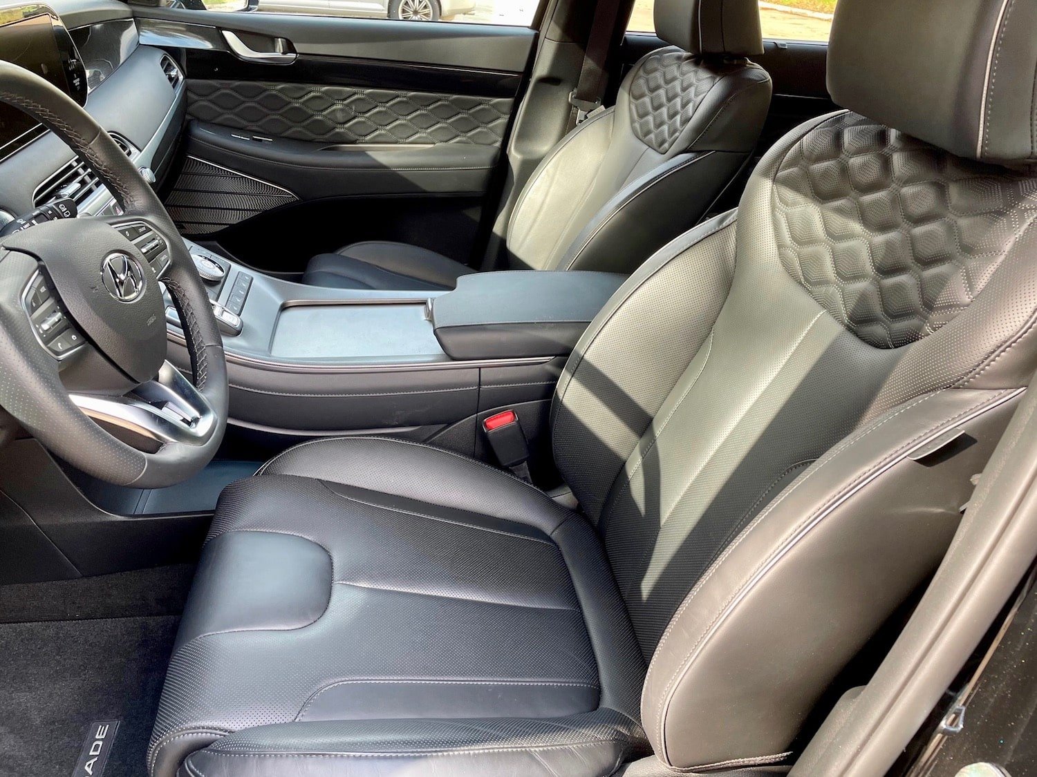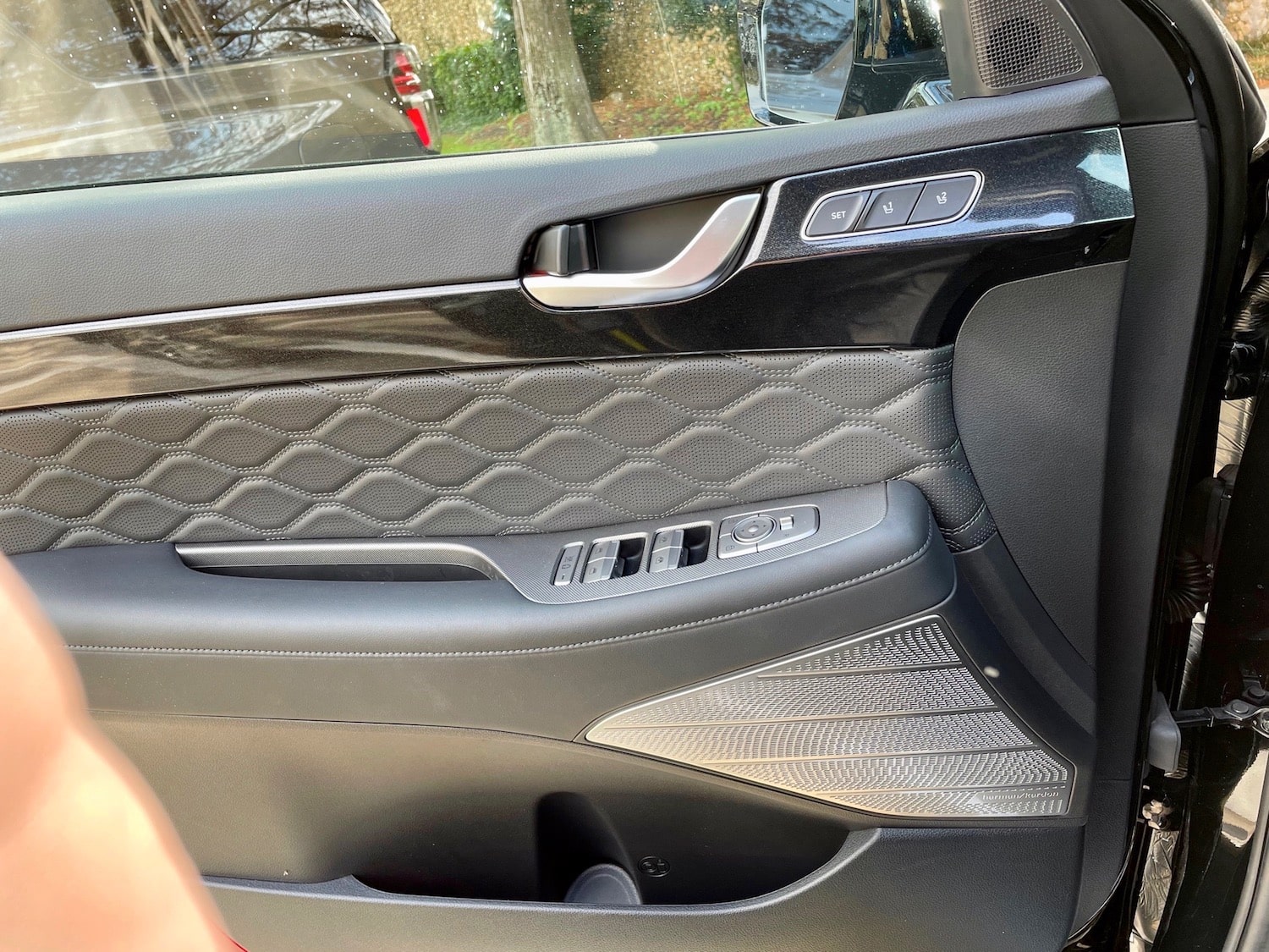 Open the door to the Palisade and you’ll see beautiful quilted Nappa leather seats and gorgeous door panels with elegant Harmon Kardon speaker covers.