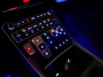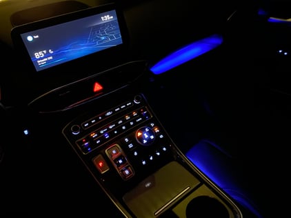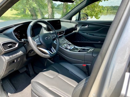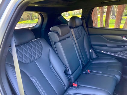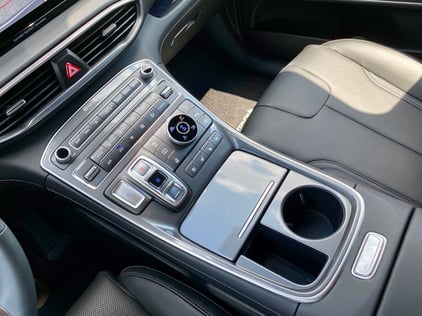 The Santa Fe Calligraphy’s well-designed black interior is user friendly with premium trim on the door panels. The Calligraphy trim means you’ll be sitting in quilted Nappa leather seats underneath an eco-suede headliner, and helming a leather-wrapped perforated, heated steering wheel. The driver’s seat is 8-way power adjustable with 4-way power lumbar - and what a nice surprise to have a power leg cushion extender. The passenger’s seat is 6-way power. Both front seats are heated and ventilated. A huge panoramic sunroof sits above and ambient lighting looks great at night.