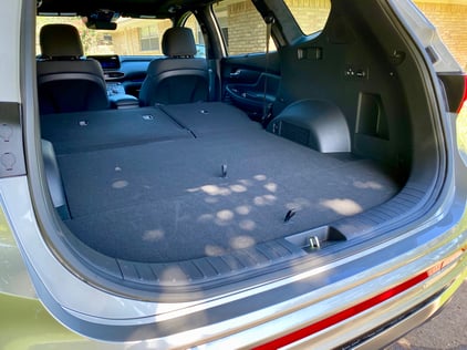 The 2nd row also has a 60/40 fold-flat split, and surprise again, there’s a 2nd-row power release button in the cargo area. Speaking of which, the cargo space is impressive and it’s not just what you can see. There is hidden storage as well, and a lot of it, underneath the cargo mat. Hyundai says it increased rear cargo area volume by one-half cubic foot. It’s also easy to access with the hands-free power liftgate with a power close button.