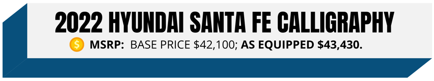 I’m impressed with the pricing on the Santa Fe Calligraphy - I consider it a great value at $43,430 as equipped. $155 carpeted floor mats are my test model’s only listed option.