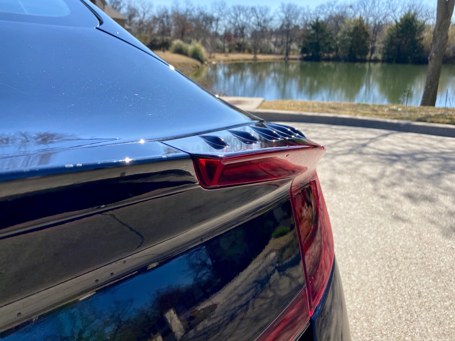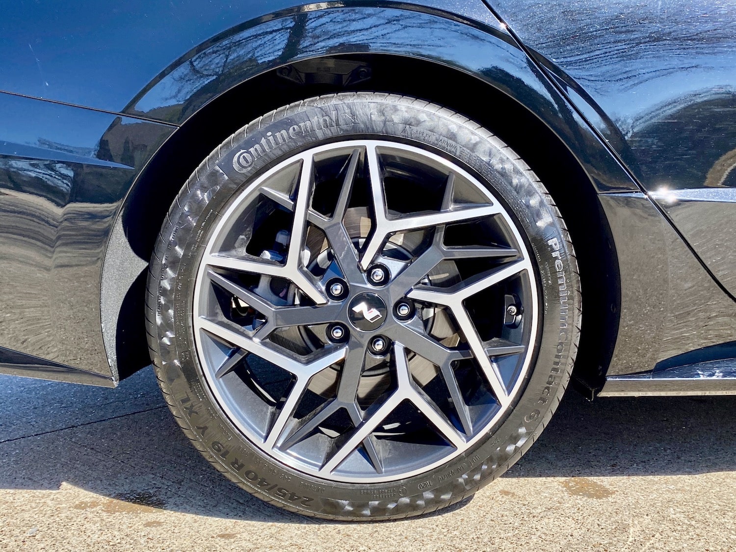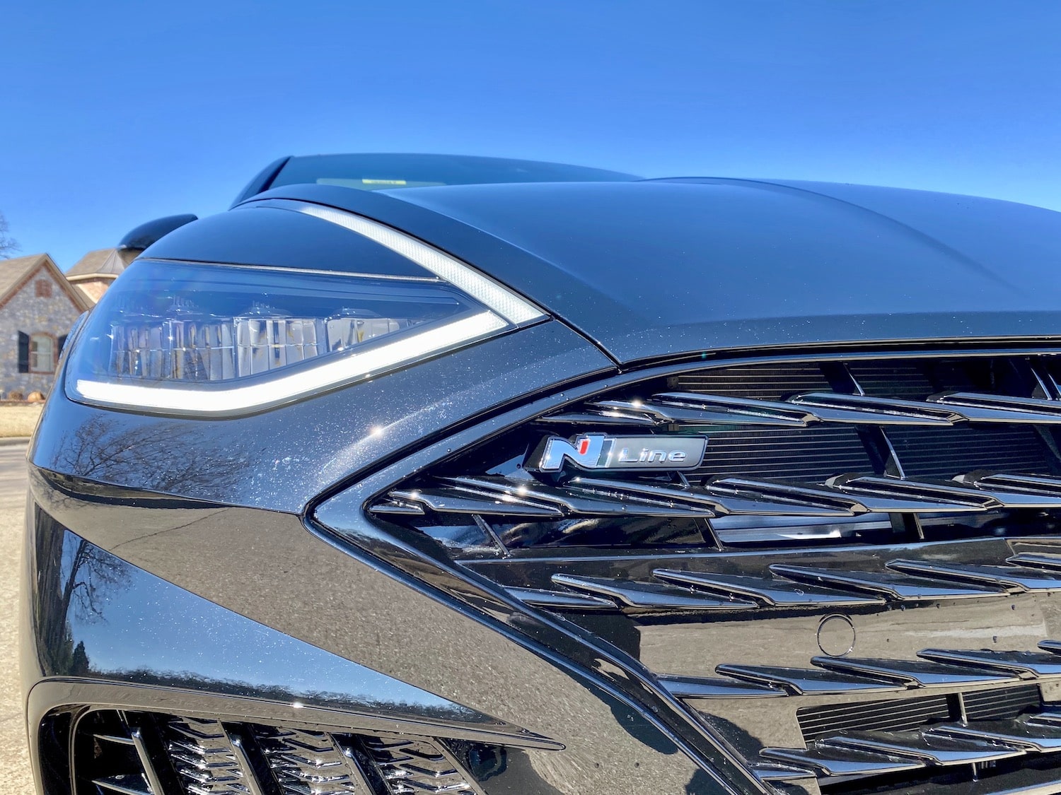 Special N line badging denotes my Phantom Black-hued fast-back coupe’s sporty status. It sports a huge glossy black-out grille up front and rides on unique, terrific-looking 19-inch alloy wheels, and this model is equipped with optional summer tires. The N Line also differentiates itself with a unique sport front fascia and rear bumper. Body-colored door panels adorn the sides as do power-folding, heated side mirrors. You get full LED headlights and tail lights. The N Line also adds a rear spoiler, dual twin exhausts and a unique N Line diffuser. A panoramic sunroof is standard on the N Line and Limited trims.