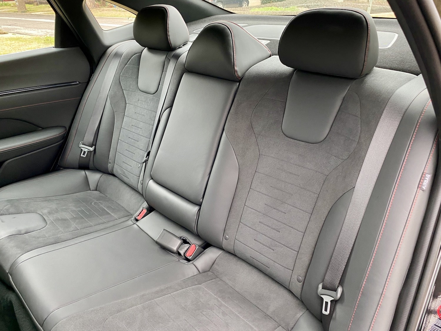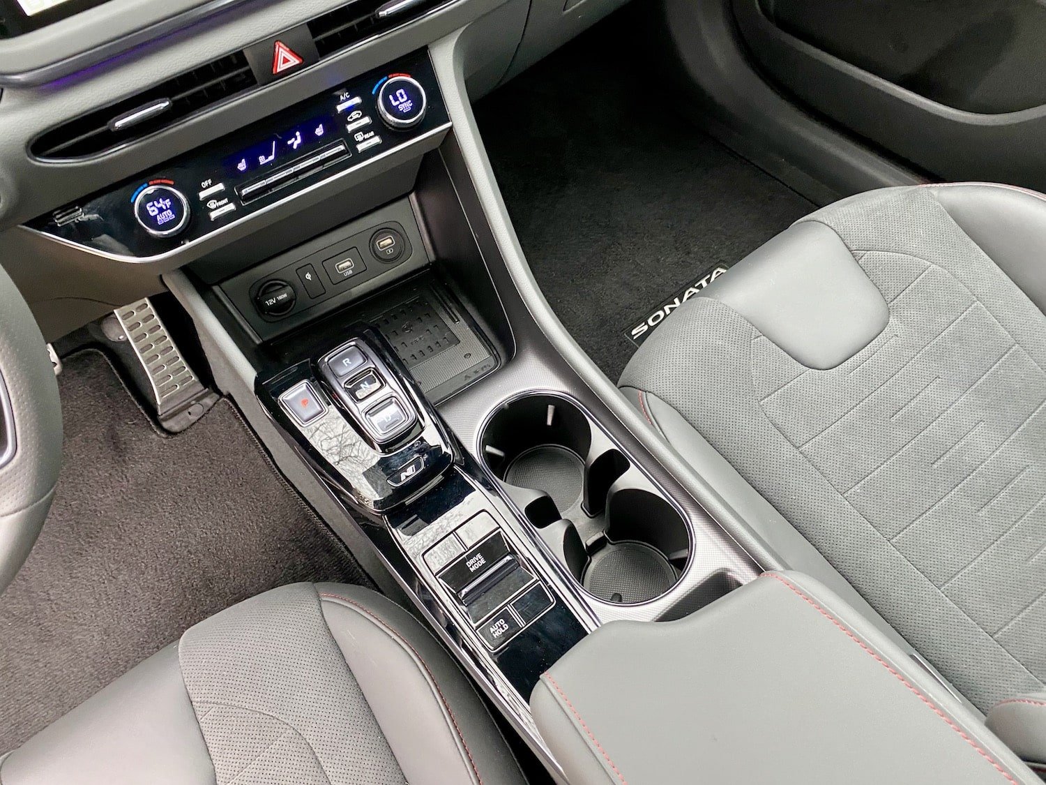 The Sonata's interior and technology has impressed since its 2020 redesign. Sportier than the Limited models, the light black interior features dark chrome trim on the interior with red N Line stitching and ambient lighting. Well-designed, comfortable Nappa leather sport-bolstered, heated front seats feature suede inserts and N line badging. I like the Sonata’s longer seat cushion length. The driver’s seat is 8-way power with lumbar, the passenger’s is 6-way manually adjustable. The leather-wrapped steering wheel is unique to the N Line. Aluminum pedals greet your feet.
